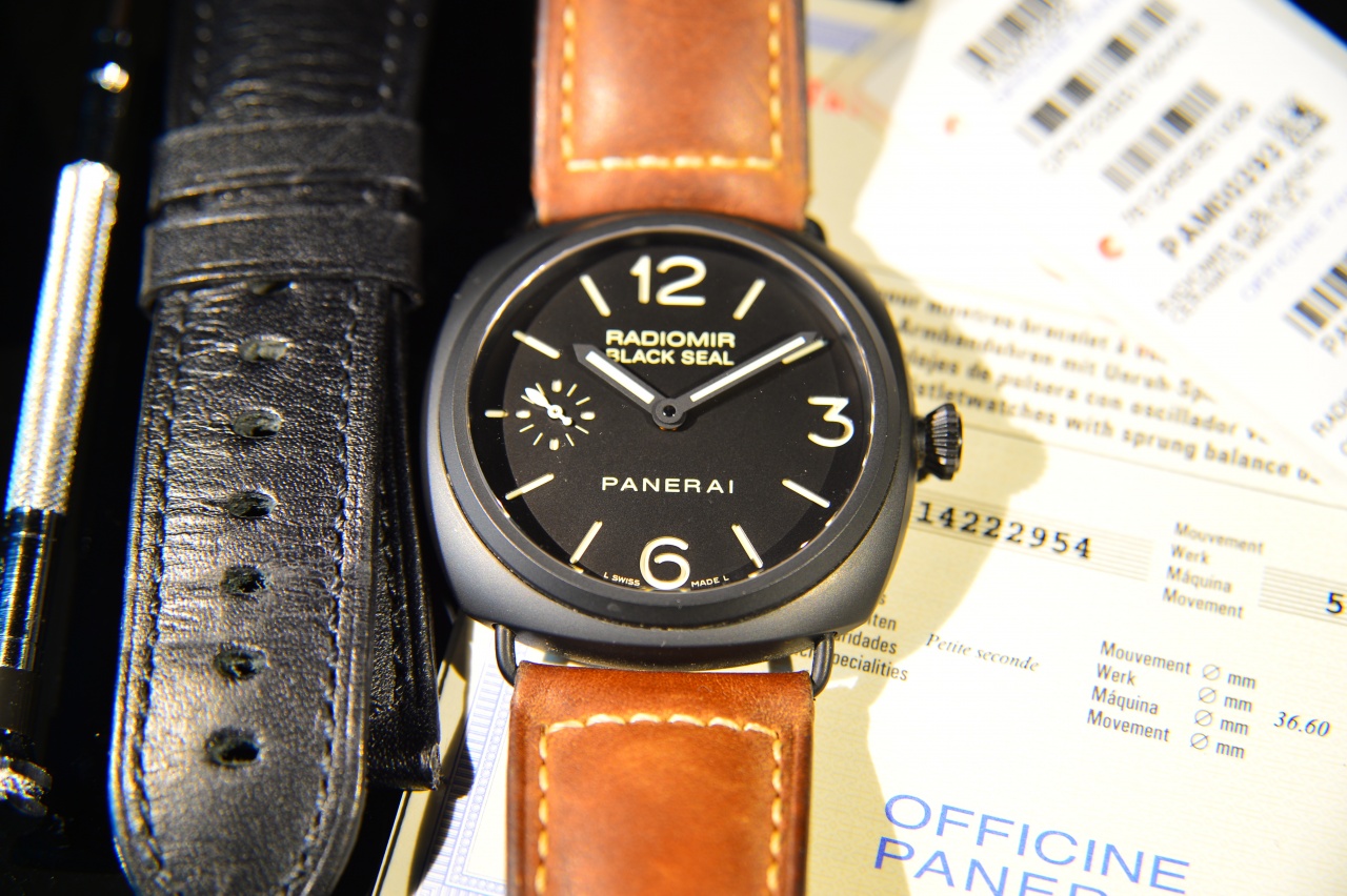 Керамический, стойкий к любым воздействиям корпус, классический, мгновенно узнаваемый дизайн Panerai серии Radiomir Black Seal в стиле "милитари". Циферблат "сэндвич" - состоит из двух слоев: нижний, покрытый фирменным люминисцентным составом и верхний с прорезными цифрами и часовыми метками.