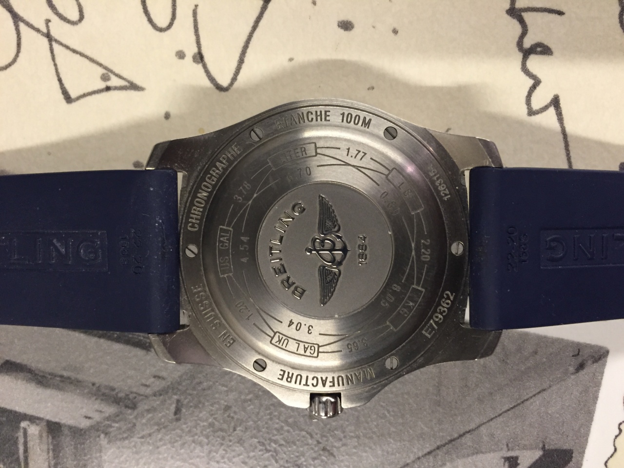 Калибр Breitling 79, термокомпенсирующийся кварц, точность хода 10-15 секунд в год, за последние 4 месяца "убежали" на 1,5 секунды. Функции: хронограф, календарь, таймер обратного отсчета, будильник, второй часовой пояс, минутный репетир. WR 100 m. Диаметр 42 мм, толщина 10,5 мм. Стекло сапфировое, антибликовое с двух сторон. Полный комплект,коробка, кожаный чехол, сертификат, инструкция, электронная гарантийная карточка.