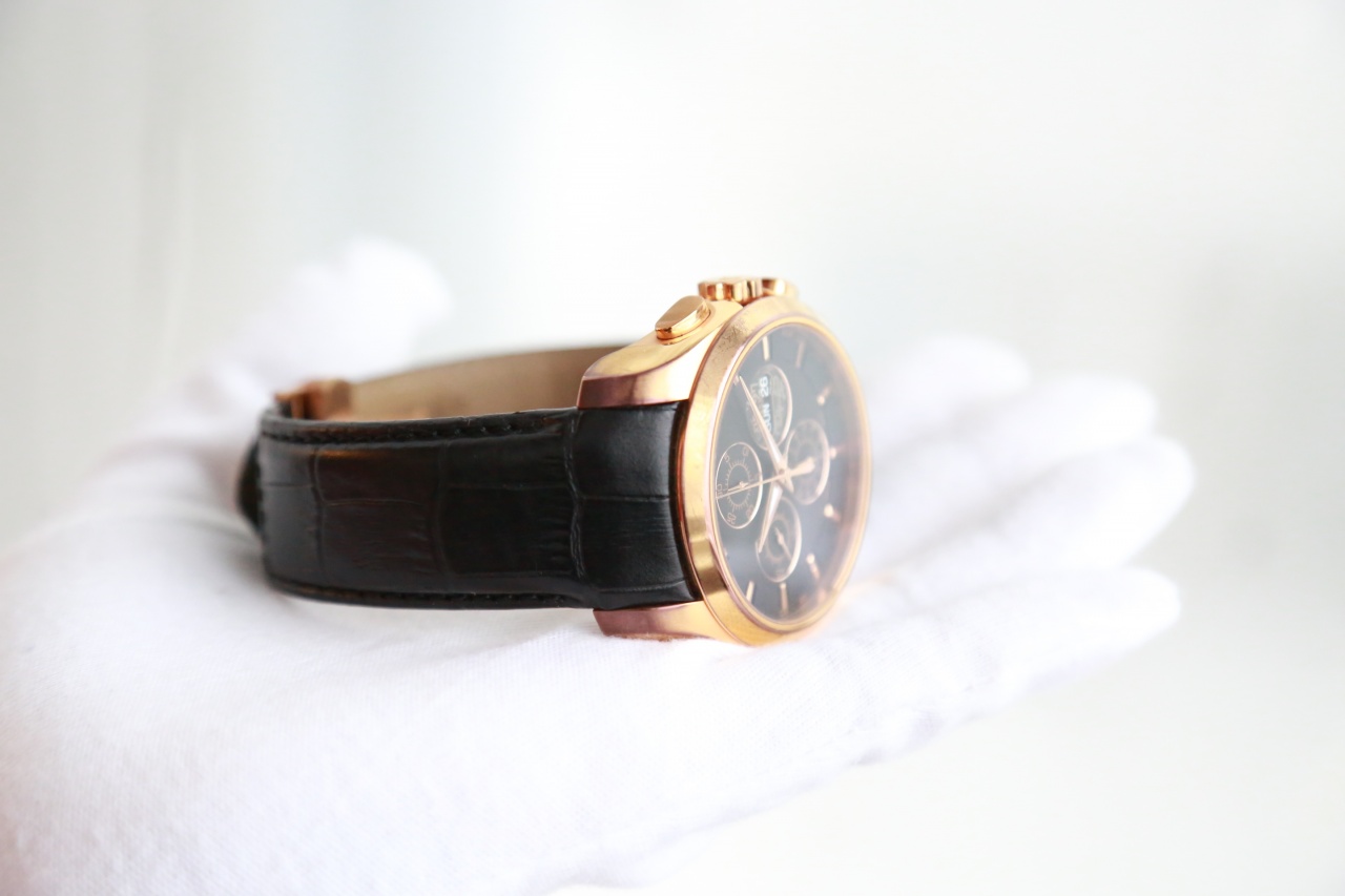 Часы куплены в августе 2013 г., находятся на гарантии до августа 2015 г. По техническому состоянию никаких вопросов, все работает как положено. Теперь по внешнему виду: часы эксплуатировались ежедневно, как при нормальной носке на работе в офисе, так и на отдыхе. В связи естественным износом, осенью 2014 года, ремень был заменен на новый оригинальный у официалов. После установки нового ремня, часы носились не более 2-х недель, далее лежали без дела. На часах есть следы носки, в виде микроцарпинок, а так же, потертостей покрытия PVD, что особо заметно по заводной головке, кнопкам хронографа, "граням" безеля и торцам "ушек", между которыми закреплен ремень, сколов нет, по стеклу никаких нареканий. Хочу сказать, что все эти недостатки заметны при близком осмотре часов, с расстояния менее 50 см. При повседневной носке на руке, описанные следы износа не заметны, зато сами часы смотрятся очень солидно и я бы сказал, благородно, в некотором даже роде "винтажно" =)