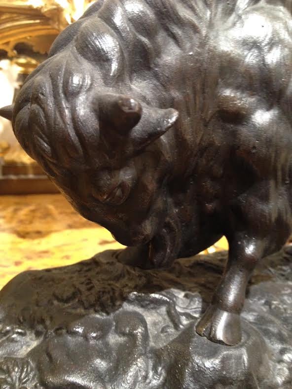 На овальной подставке с поземом фигура бегущего рогатого длинношерстного животного с низко опущенной головой.