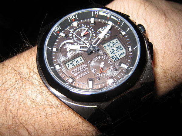 AlexB в своем отчете о приобретении часов сделал достаточно их фотографий, поэтому не буду дублировать, приведу лишь парочку фоток, одна, как здесь принято, с часами на руке, а вторая с ячейками солнечных батарей на циферблате