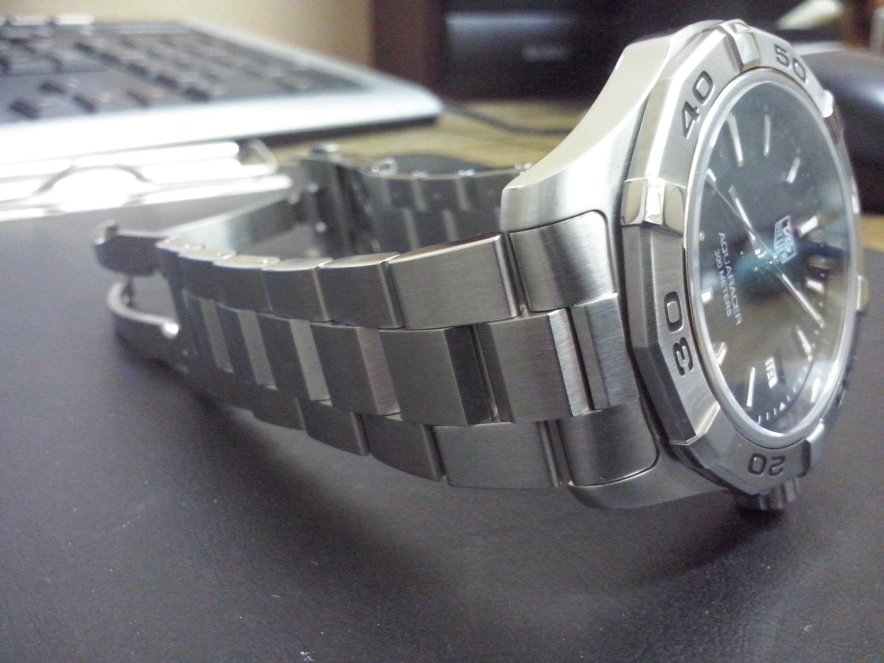 Уважаемые форумчане! В продаже TAG Heuer Aquaracer WAP1110.BA0831. Давно присматривался к этой марке. Не шайба и не мелочь, сапфир (защищен «красивограненым» безелем, вращающимся с приятными щелчками- люфтов, ничего неприятного нет, метки попадают идеально), водозащита 300 м, кварц Механизм ETA F06.111. Индикация числа. Люминесцентные стрелки и часовые метки. Стальной корпус. Диаметр 39мм, толщина 10мм. Коробка-упакован в белый картон, в ней обычная коробка с крышкой с логотипом Таг…снимаем крышку, под ней еще коробка. Внутри на сливочном цвета кожзаме часы… Создают впечатление монументальности и основательности, стекла как будто нет совсем-сапфир. Стрелки и метки из полированного металла, что мне понравилось, секундной стрелки иногда под определенным углом не видать…Идут в «ноль», что порадовало-точность очень уважаю. Для перфекционистов- стрелки ровнехонько попадают в метки. Браслет в основном сатинированный, с ярко выраженными гранями, лишь края звеньев полированные…Застежка широкая, длинная, надпись выведена очень четко и кажется дорого выглядящей, если можно так сказать (выведена лазером). Браслет порадовал негремучестью, руку не эпиллирует, очень и очень комфортный. Все звенья, в том числе и концевые, конечно же, литые, к корпусу примыкание идеальное просто. Достаточно увесистые, но и не тяжелые, при этом форма позволяет очень хорошо устроить на руке и при своих 40 мм выглядеть немаленькими. На крышке изображение шлема от тяжелого скафандра водолаза и соответствующие техническим характеристикам надписи.
