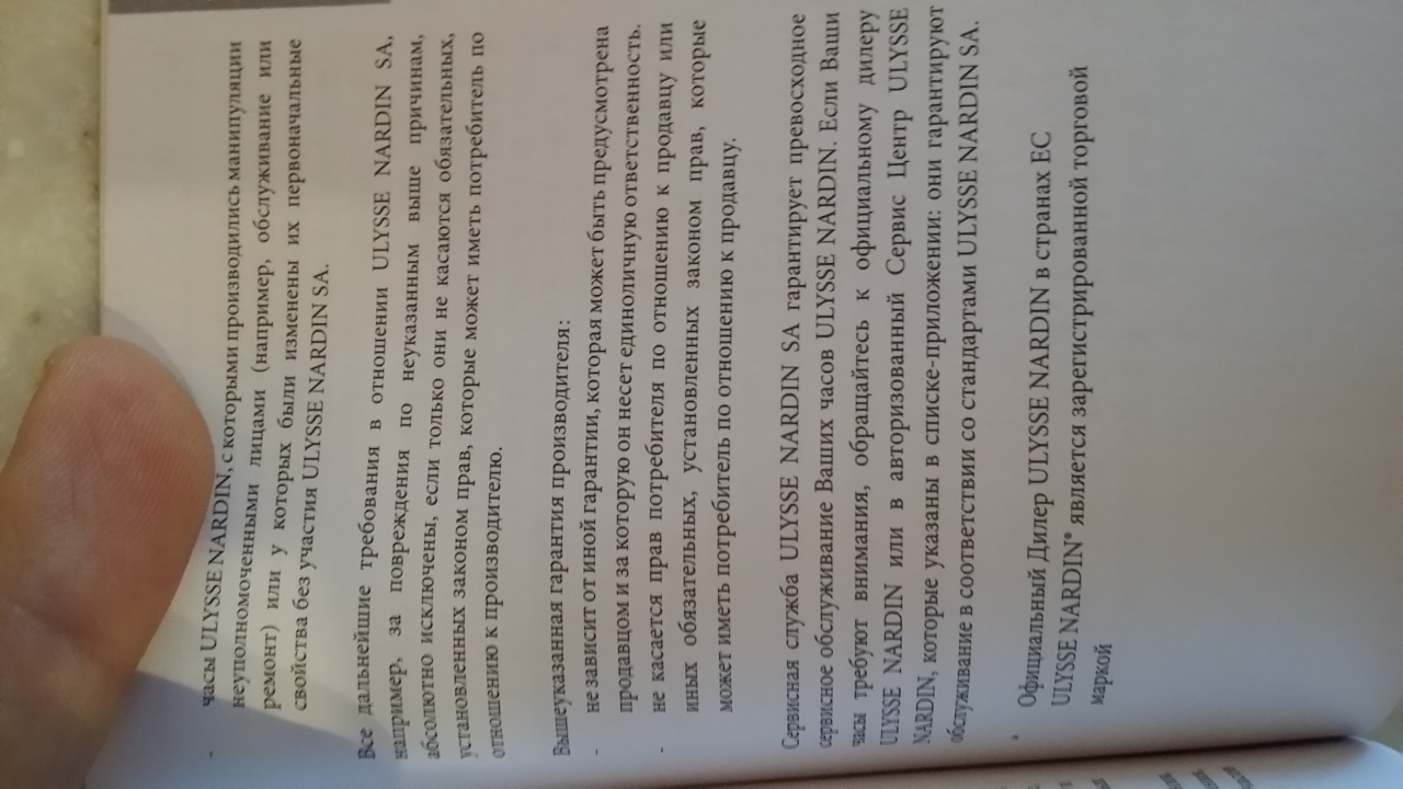 Форумчане нужна помощь! Потерялась гарантийная книжка. Если возможно скиньте фото с гарантийными обязательствами, а если конкретно, то что не подподает под гарантию. История такова, имею дуал тайм на браслете. С браслета выпал якорь, который благополучно потерялся.Обратился в сервисный центр на Большом Сергеевском переулке в Москве с указанной проблемой. Представитель сервиса тут же мне заявил, что это не гарантийный случай, поскольку является аксессуаром и не является частью часов. Было предложено тут же приобрести часть браслета (4 звена) с указанным якорем. Однако я продолжал настаивать на своем, с просьбой забрать часы и дать официальное заключение. Одновременно мне было предложено самостоятельно, через офсайт Ulysse Nardin обратиться в Швейцарию и описать суть проблемы и если они согласятся, то мне поменяют его по гаранитии, на что я категорически отказался, настояв что они должны сделать это самостоятельно. В конечном итоге часы забрали, но сегодня по телефону мне дали аналогичный ответ, что это не гарантия (при этом в Швейцарию за разъяснениями они не обращались).