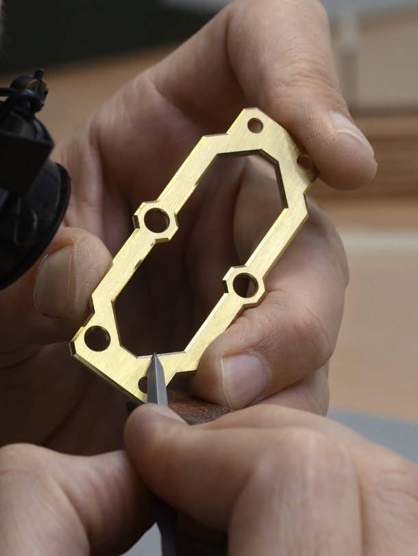 На граненые серебряные ножки настольных часов вручную нанесены 12 уникальных гильошированных узоров, которые переливаются прозрачными цветами эмали Grand Feu. Поскольку все ножки являются частью цельной конструкции часов, мастеру гильоширования пришлось украсить узором все пять граней, что значительно усложнило создание рисунка. Но такие необычные трудные задачи помогают мастерам Vacheron Constantin раскрывать все новые грани таланта.