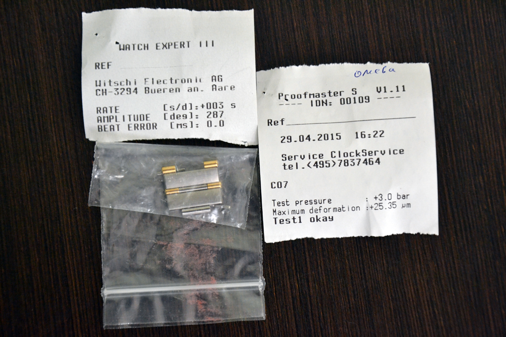 В мае 2015 года часы прошли обслуживание механизма и полировку корпуса, после чего не носились. Состояние идеальное. В комплекте все звенья браслета.