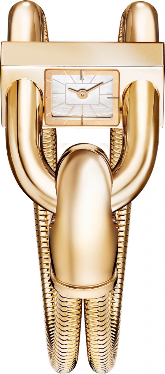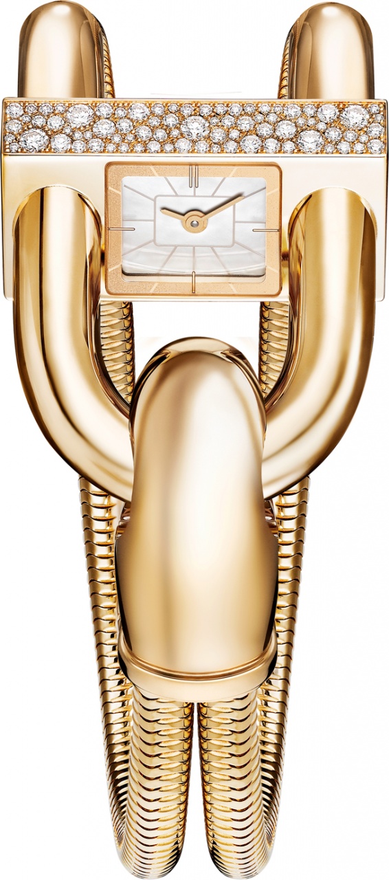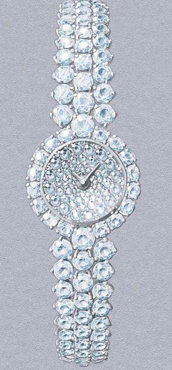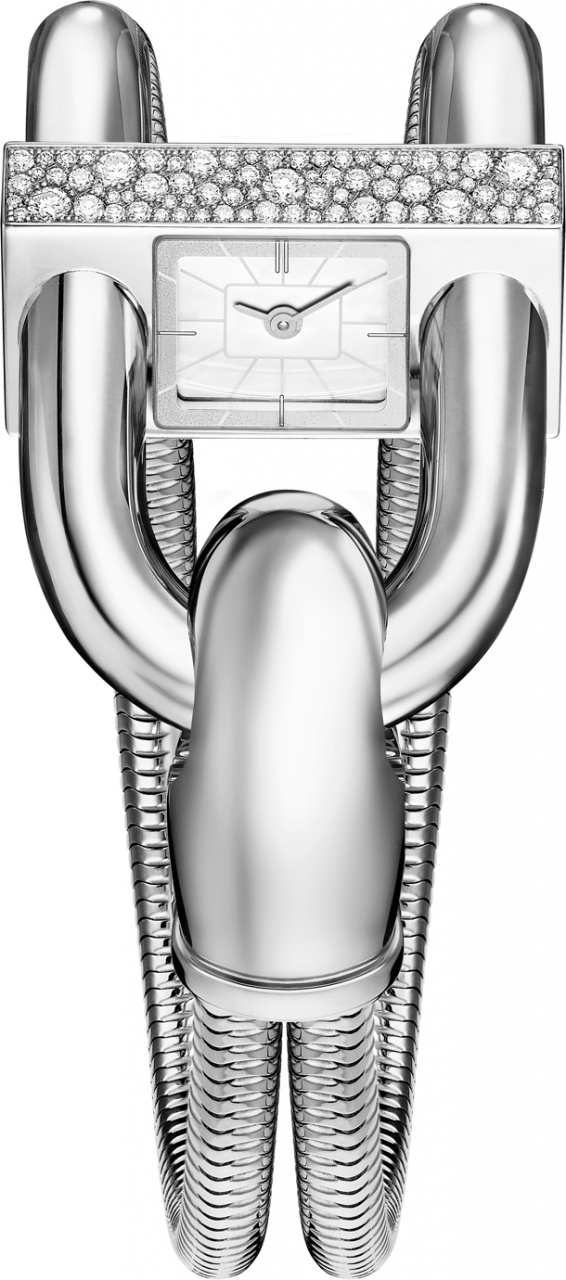 В самой ранней версии циферблат был спроектирован таким образом, чтобы владелица часов могла взглянуть на него незаметно для окружающих, не нарушая правила этикета того времени. В новой модели представлен циферблат увеличенного размера с 12 часовыми метками, который обеспечивает легкое считывание показаний, но, как и в изначальной модели, он расположен под наклоном. Эти роскошные часы украшены сверкающим «снежным» паве из бриллиантов. Благодаря двум керамическим бусинам внутри застежки крепление часов стало еще надежнее. На внутренней отполированной стороне застежки можно выполнить невидимую постороннему глазу персональную гравировку.