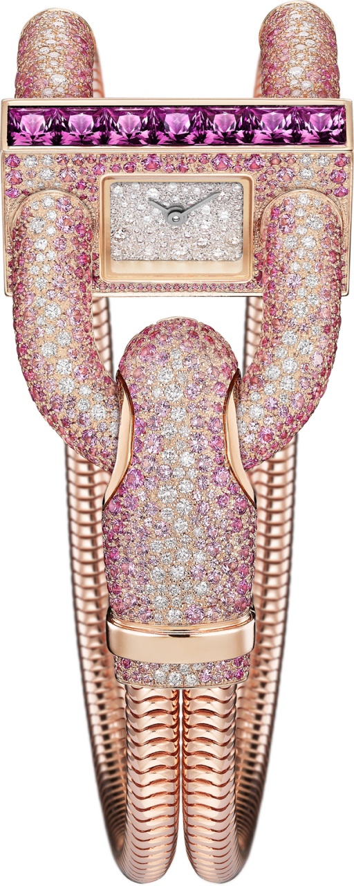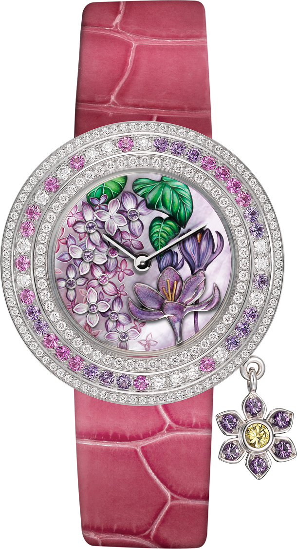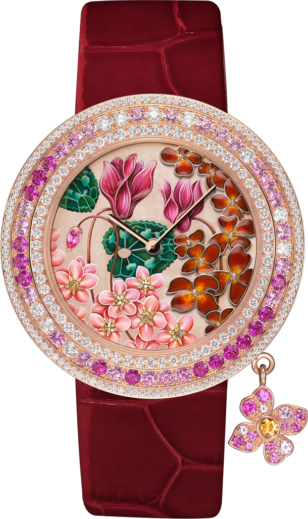 Charms Extraordinaire Amour. Лакфиоль, незабудки и цикламен на этих часах с корпусом диаметром 38 мм из розового золота символизируют счастливые воспоминания, красоту и долговечные чувства. Благодаря искусной и тонкой работе мастера циферблат часов выглядит невероятно выразительно: кажется, что цикламены, созданные в технике миниатюрной росписи на скульптурном перламутре, покачиваются, словно живые. Ощущение движения рождается и благодаря эмали cabochonné, использованной при изображении лакфиоли. Бутон цикламена выполнен из грушевидного розового сапфира. Цветы обрамлены сапфирами разных оттенков розового: они перекликаются со спессартином и розовыми сапфирами на подвеске в виде цветка лакфиоли.