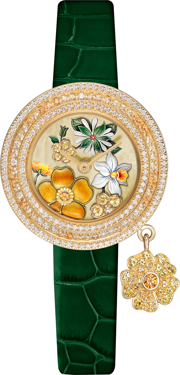 Charms Extraordinaire Espérance - самая миниатюрная модель коллекции с корпусом диаметром 25 мм из желтого золота словно пронизана солнечными лучами. Лютик, выполненный в технике эмали cabochonné, олицетворяет красоту, нарцисс — стремление найти истинную любовь, а звездчатка символизирует встречу, на которую надеются влюбленные. Нарцисс, вырезанный на перламутровом циферблате и затем окрашенный в желтый цвет, выглядит удивительно объемным.