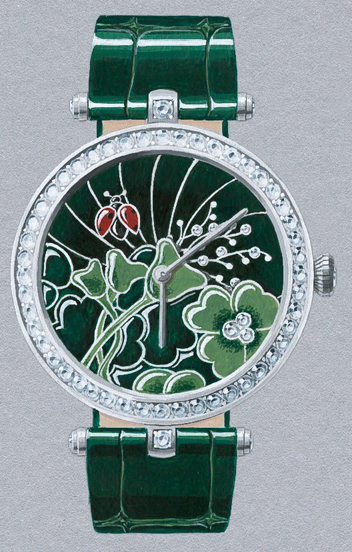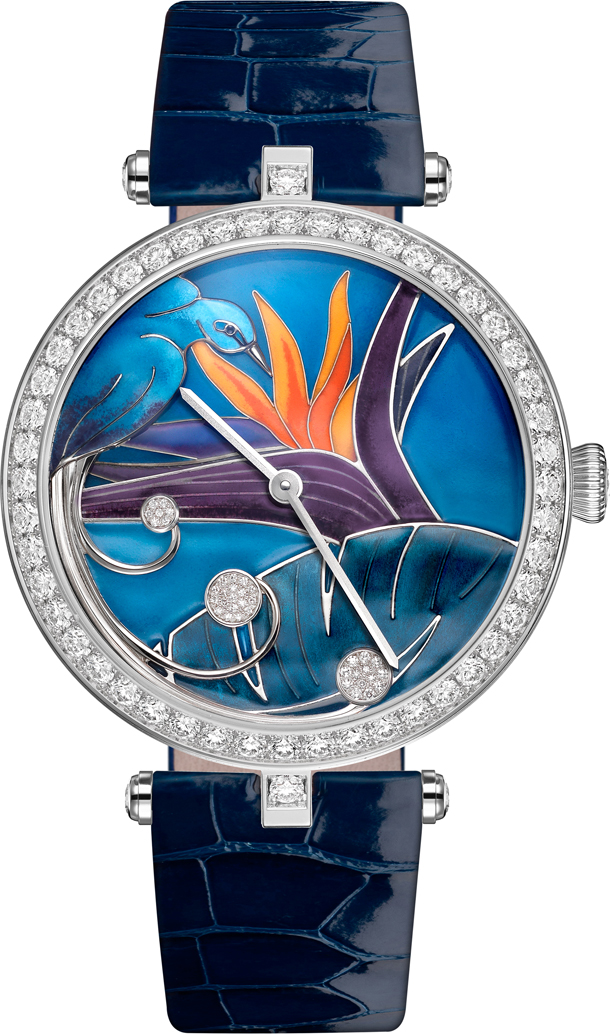 Эти часы с корпусом 38 мм из белого золота и украшенным круглыми бриллиантами безелем оснащены 24-часовым механизмом, который демонстрирует уникальные часовые технологии Дома. Данный механизм представляет собой настоящий шедевр технического мастерства: он вращается практически незаметно все 24 часа. На циферблатах двух новых моделей, роскошно украшенных в традиционных техниках декорирования, изображены божьи коровки и райская птица на фоне пейзажей, сменяющих друг друга согласно движению Солнца и Луны. В этом анимированном мире время течет незаметно. Мастера-виртуозы создали волшебные пейзажи, очерченные контурами эмали в техниках champlevé и cloisonné. В зависимости от времени суток диск, выполненный в технике эмали cloisonné, предлагает взгляду то дневной, то ночной пейзаж.