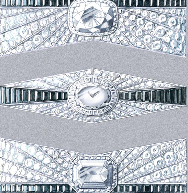 На первом браслете центральное место принадлежит бриллианту DIF 2A редчайшего качества, весом 12,03 карата. Благодаря своей чистоте и огранке «кушон» он выглядит невероятно изящно. Второй браслет оснащен циферблатом из белого перламутра. Размещенный под бриллиантом портретной огранки циферблат приводится в движение крошечным механическим калибром. Третий браслет украшен бриллиантом DIF 2A весом 11,20 карата: красота его изумрудной огранки и чистота блеска придают украшению неповторимое очарование. Бриллианты эффектно оттеняются черной шпинелью (историческая партия 1925 г.), которая подчеркивает оригинальность этих уникальных часов.