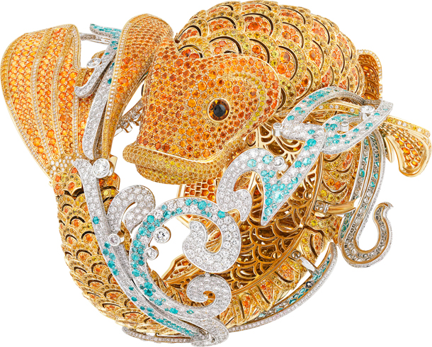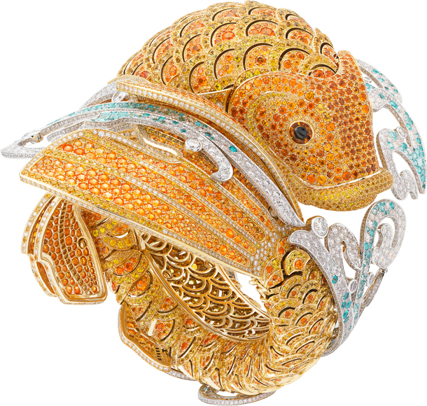 В часах-браслете Carpe Koï воплотилось все виртуозное искусство мастеров Mains d’Or™ («Золотые руки»). Для изготовления этого уникального изделия, украшенного 8000 цветных камней, потребовалось 3450 часов кропотливой работы. Часы отличаются необыкновенным разнообразием драгоценных камней, тщательно отобранных специалистами Van Cleef & Arpels согласно высочайшим стандартам качества. На теле рыбы, изготовленном из желтого золота, сверкают желтые сапфиры и спессартины, образуя изумительную градацию цвета.Голубые завитки из белых бриллиантов и турмалинов, подобных Параиба, напоминают о спокойной и безмятежной жизни в глубине вод. Браслет, охватывающий запястье, словно защитный талисман, можно расстегнуть, нажав на хвост карпа. Непревзойденно изысканный характер этих ювелирных часов подчеркивается элегантной деталью: рот рыбы изящно раскрывается, и взору предстает усыпанный драгоценными камнями циферблат.