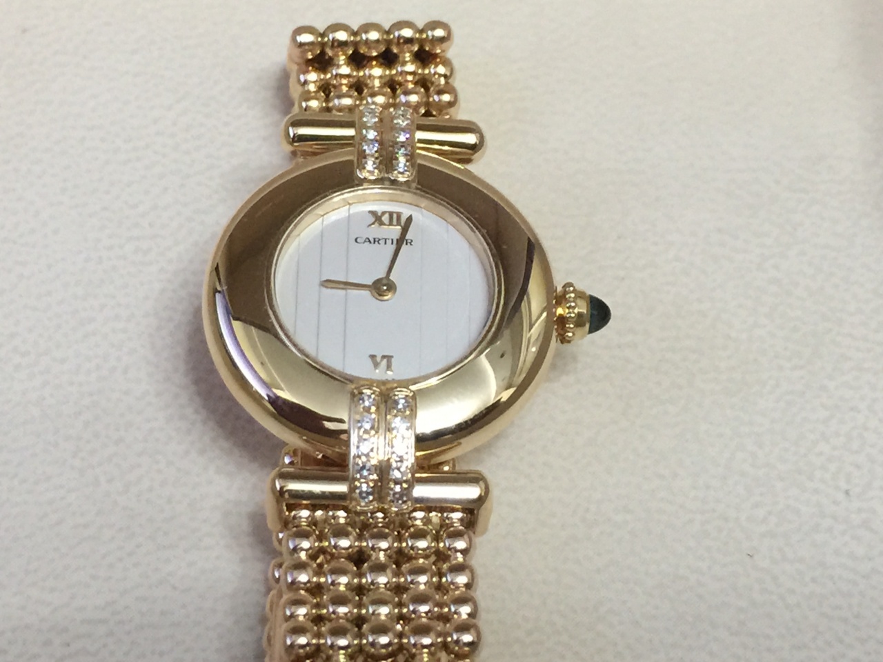 В продаже изящные женские часы ювелирного супербенда Картье полностью золотые (750 проба) с бриллиантами, которые украсят любую женскую руку.