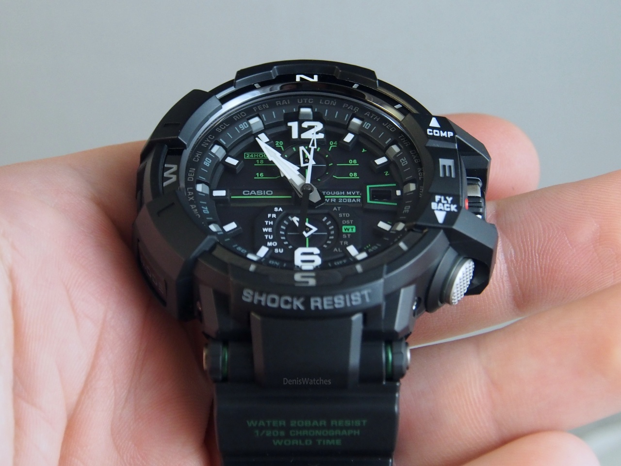 Ударопрочные многофункциональные наручные часы с компасом и автоподстройкой по радиосигналам точного времени оснащенные функцией калибровки положений стрелок.