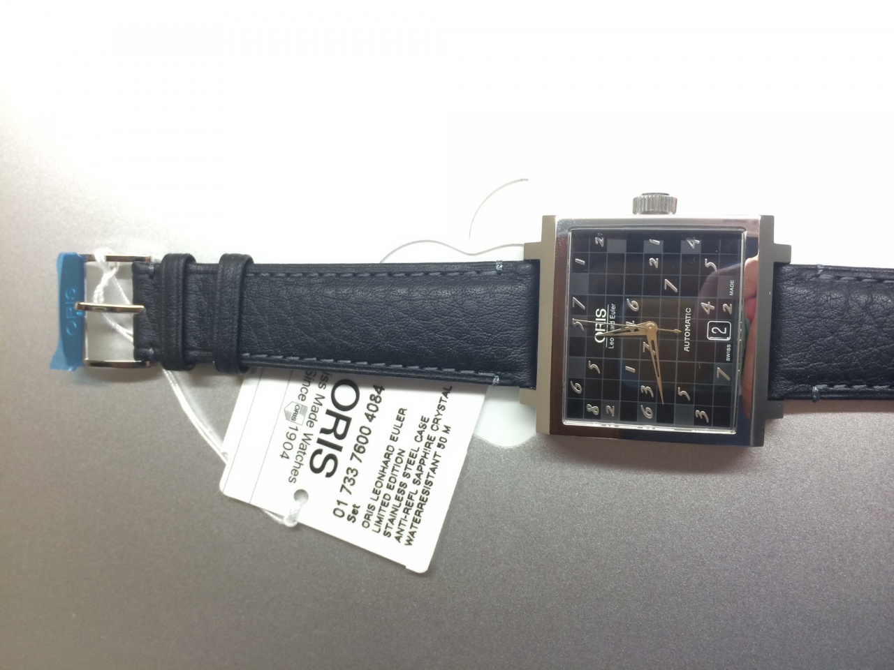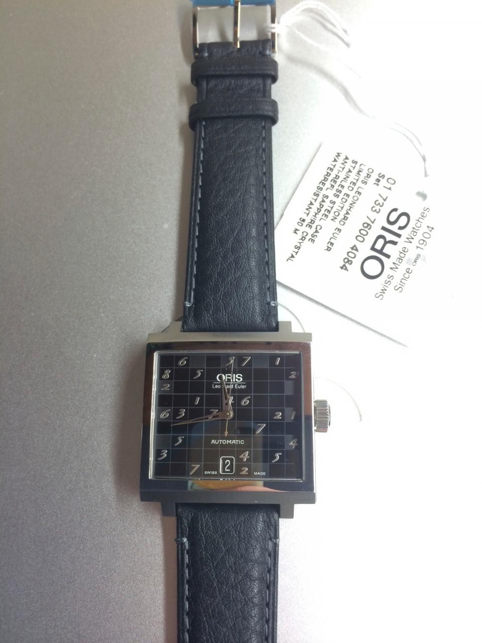 Представляю оригинальные часы Орис, выпущенные к 300-летию со дня рождения швейцарского математика.квадратный корпус и циферблат с тематикой игры Судоку-принцип Судоку базируется на Латинском квадрате Эйлера. Корпус 35 х 35 мм. нержавеющая сталь. Сапфировое стекло, антибликовое покрытие. Водонепроницаемость до 50 м! Автоподзавод с двунаправленным вращающимся красным ротором, 26 камней. Ремешок из черной кожи. Часы ни разу не носились, коробка отсутствует. В наличии данную модель трудно найти, не упустите возможность приобрести эти часы!