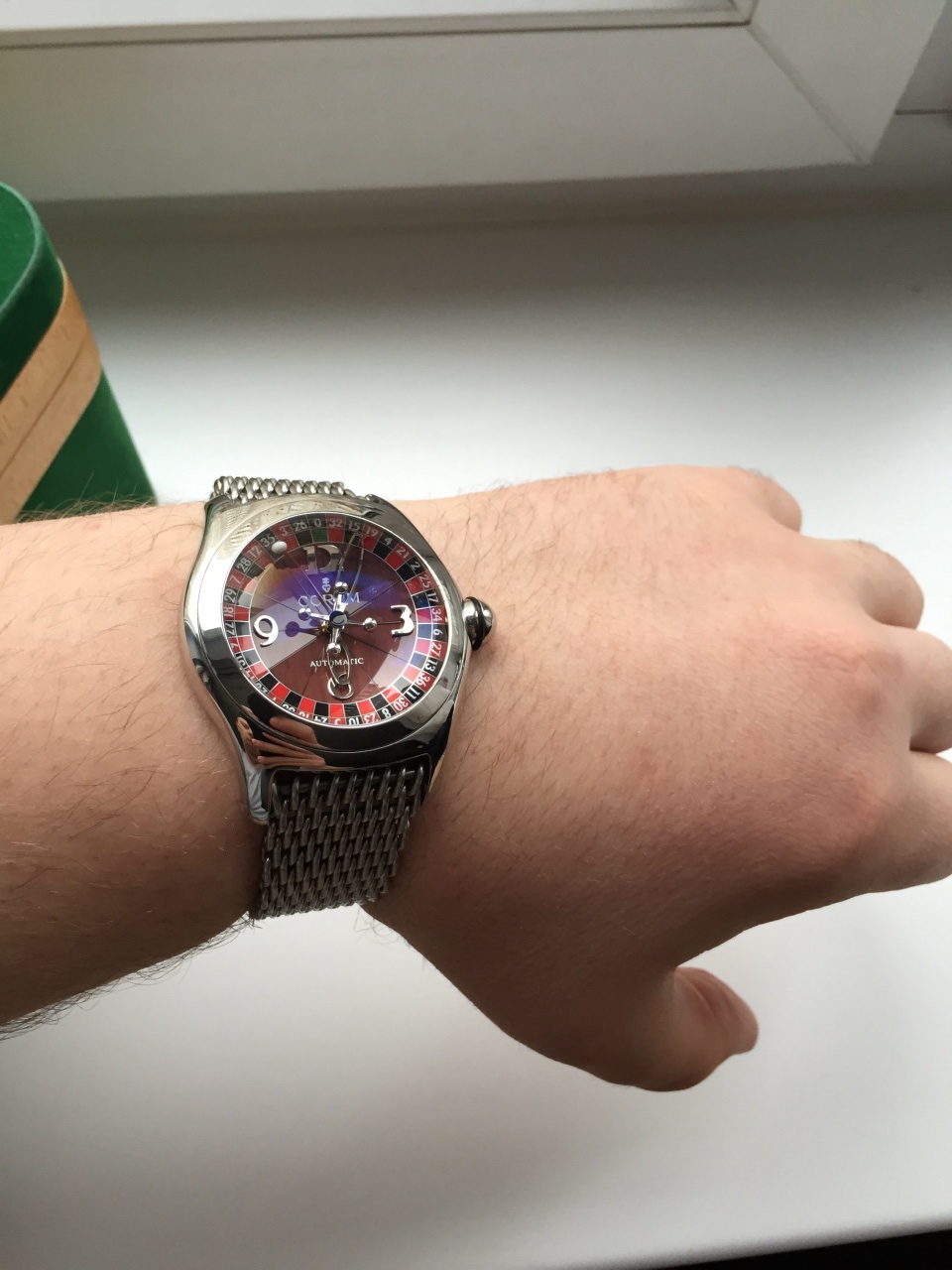 Циферблат представляет собой яркое и довольно необычное воплощение игрового стола казино.