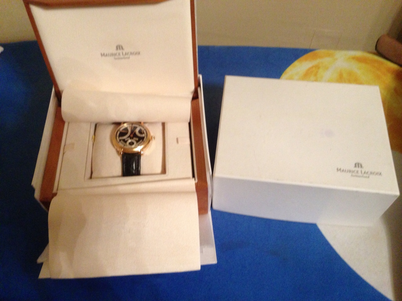 Maurice Lacroix Masterpiece Retrograde в розовом золоте на аллигаторе - простая застежка из золота. Полный комплект, коробка, документы, карточка, все ярлычки из магазина, покупал пять лет назад. Прекрасное состояние, точнейший ход. Ретроградный календарь и указатель резерва хода. Размер корпуса 43 мм. Гильошированный циферблат из серебра. Стрелки из золота. Простая застежка из золота. Ретейл 15 тыс дол. Выпускались до 2012 года. Запас хода 45 часов.