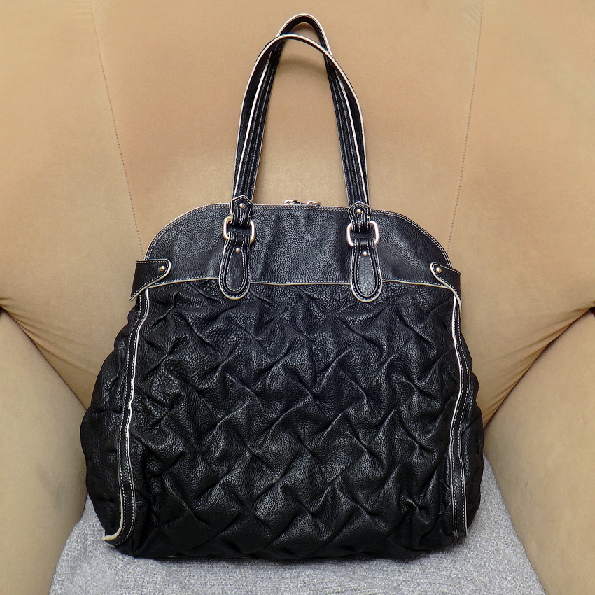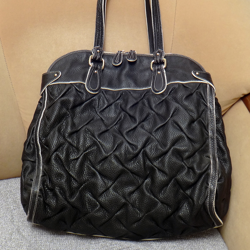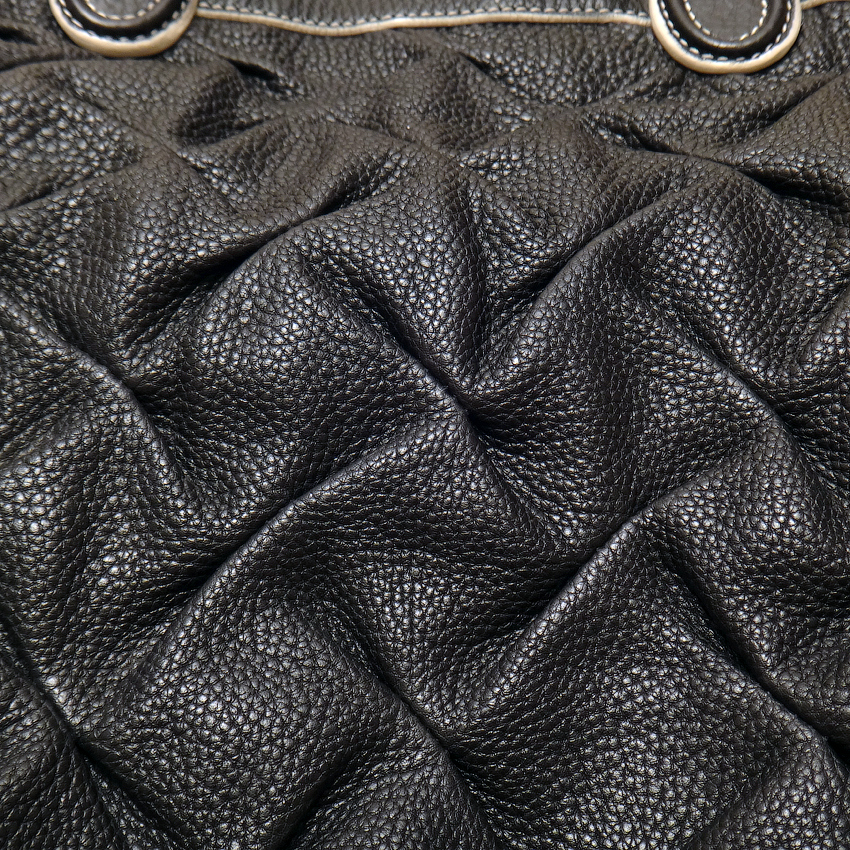 Прекрасная плотная при этом мягкая зернистая кожа, отличной выделки, изящно собранная в ромбовидные складки.