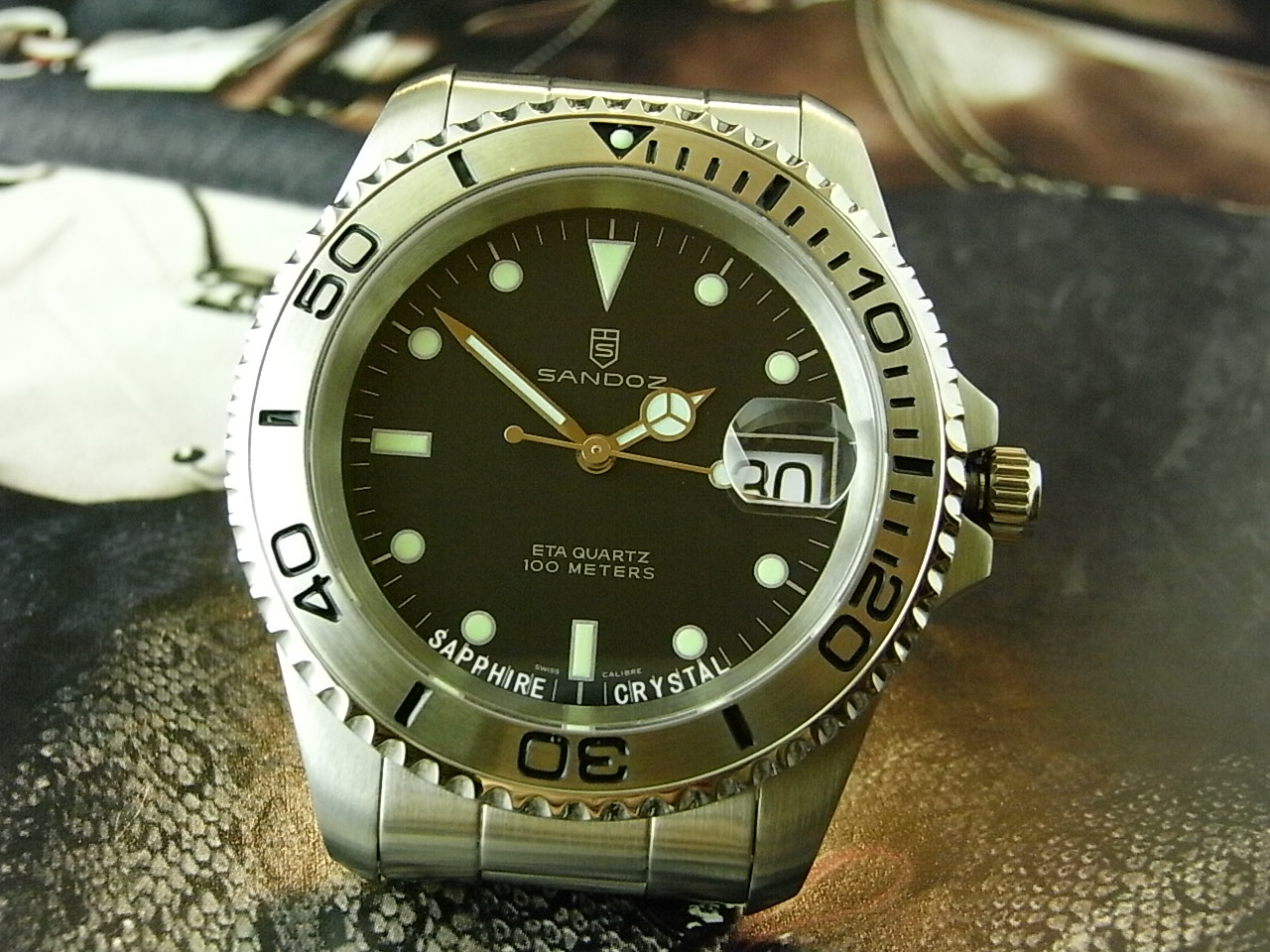 Продаю новые, в упаковке (коробка+бумаги), кварцевые (швейцарский калибр ЕTA 955-112) часы Sandoz в стиле Rolex Submariner. Водонепроницаемые - 100 м., стекло сапфир, циклоп на дате. Известная, старая часовая Компания (отделение в Гонконге). Отличный подарок.