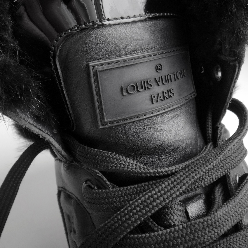 Материалы: гладкая кожа, лакированная кожа, замша, а также кожа с тиснением фирменного узора LV. Оторочка верха внутри и снаружи - мех кролика, язычка внутри тоже мех кролика. Внутри стопа и стелька утеплены овчиной.
