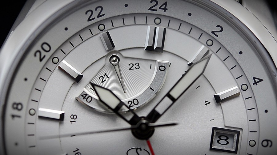 Мужские механические часы со вторым часовым поясом в 24-х часовом формате времени, отображается центральной стрелкой. Ретроградные указатели дня недели и запаса хода на 40 часов.