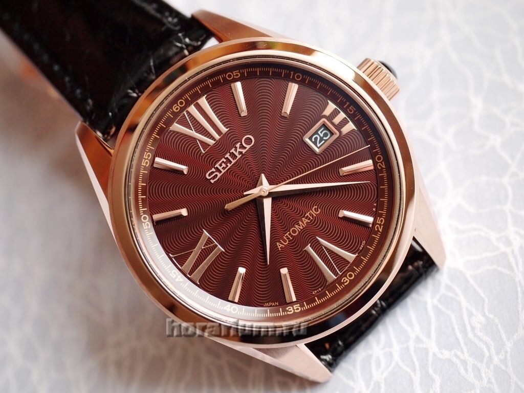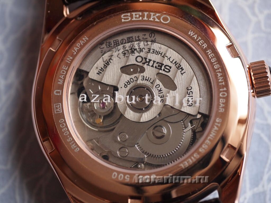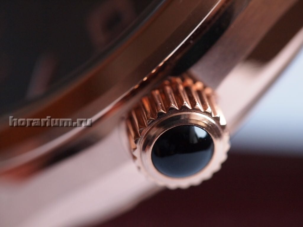 Механизм:6R15 — мануфактурный калибр 23 камня, автомат с возможностью ручного подзавода и функцией стоп-секунды.