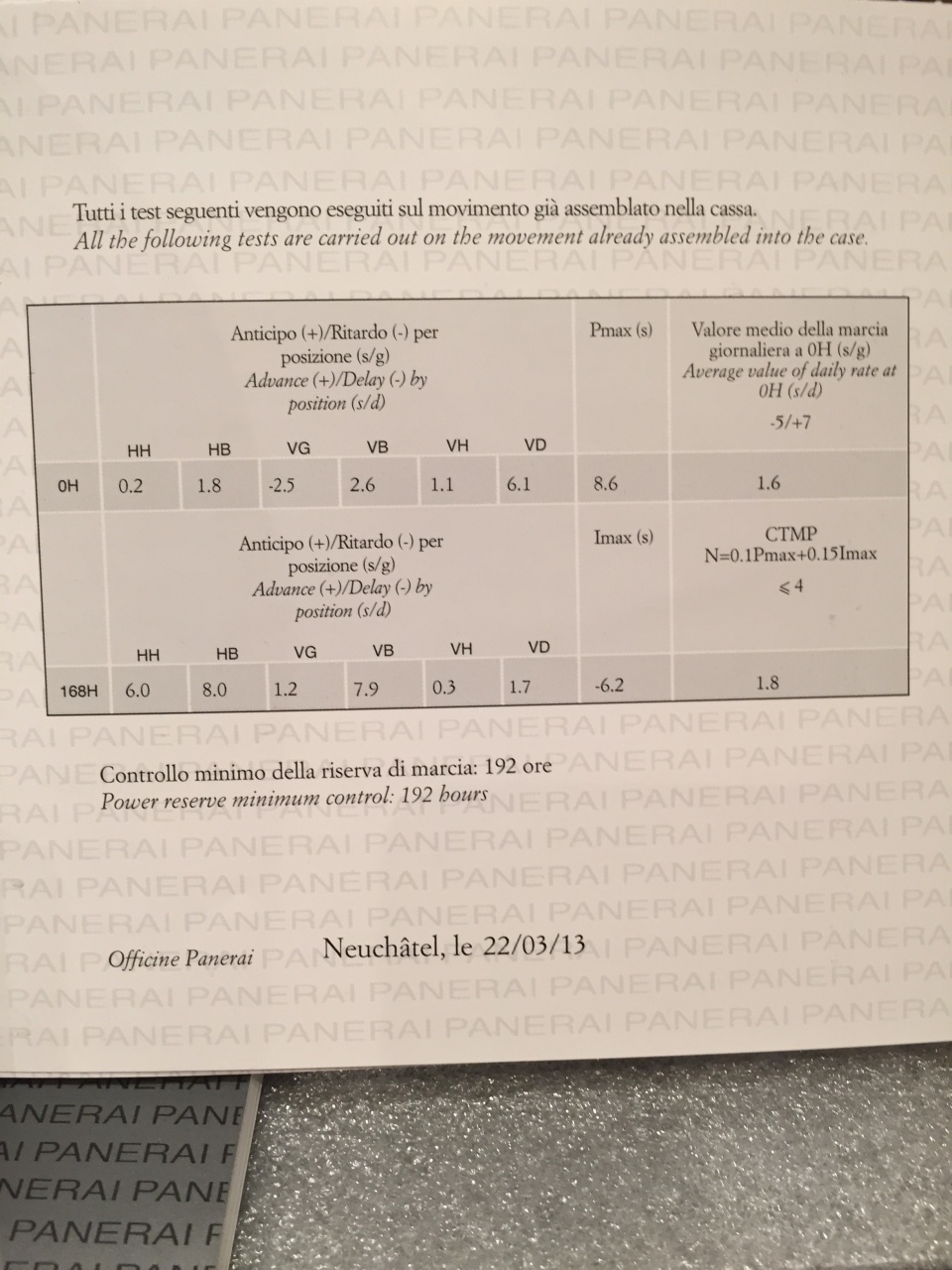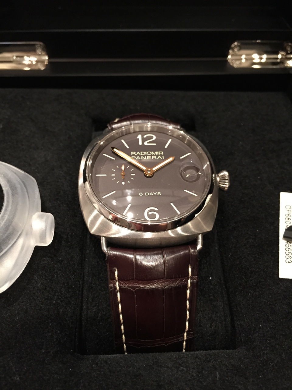 Механизм с ручным заводом, производство Panerai, 13¾ линии, толщина 6,6 мм, 23 камня, баланс из сплава Glucydur®, 28 800 полуколебаний/час. Запас хода 8 дней, индикатор запаса хода на обратной стороне механизма, три заводных барабана, устройство перевода секундной стрелки на ноль, дата. 246 деталей.