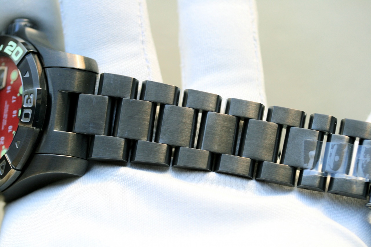 - контрастный красный циферблат на фоне черного корпуса и браслета
