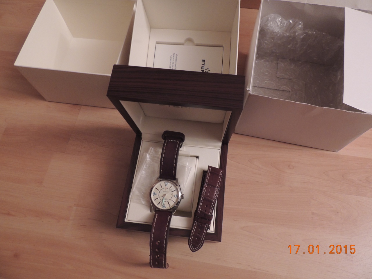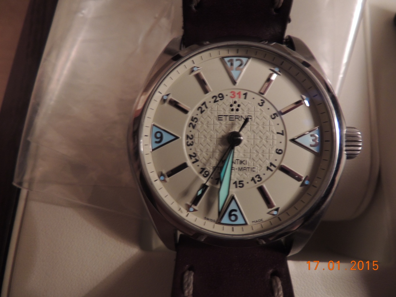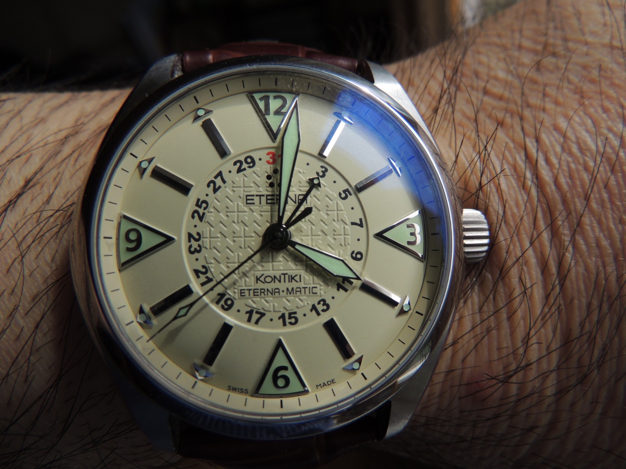 Вниманию уважаемых форумчан красивейший раритет от именитого бренда Eterna - KonTiki Four Hands. Потрясающей красоты песочный циферблат и ярко горящие разным цветом метки и стрелки (фото не совсем удачные). Незамыленная, сразу притягивающая взгляды очень оригинальная модель. Отлично подходят не только для путешествий, но и для офиса.