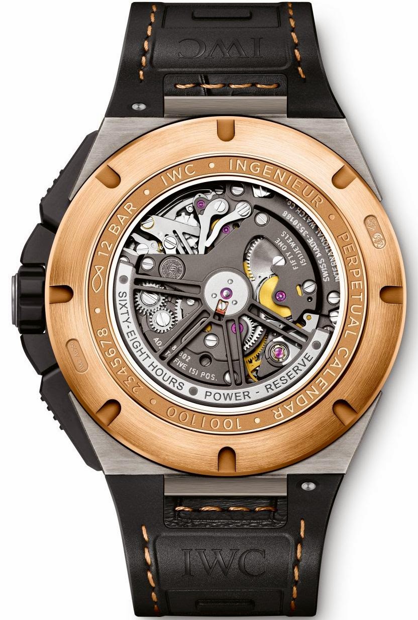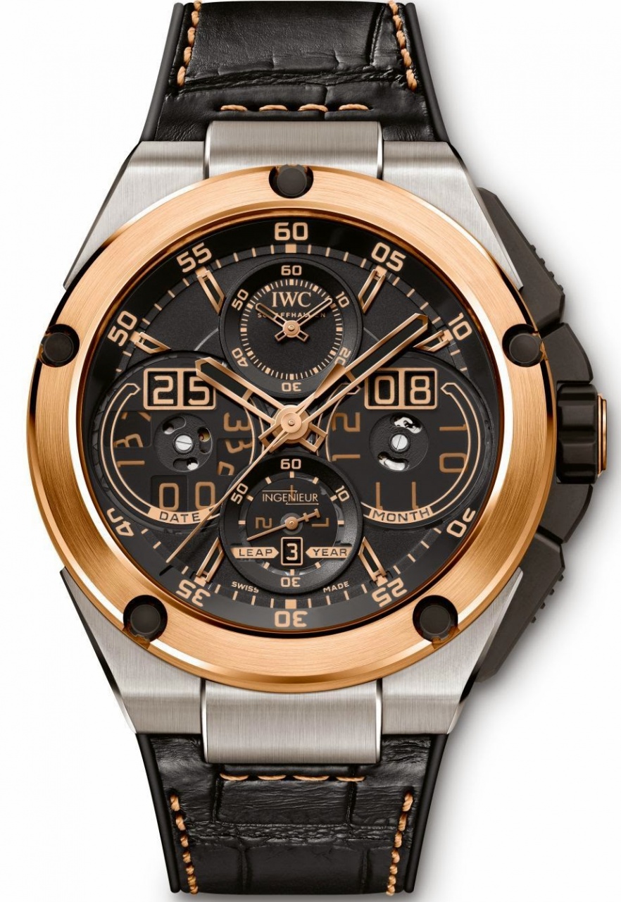 Новая лимитированная модель Ingenieur Perpetual Calendar Digital Date-Month (Ref. IW379203) от IWC Schaffhausen имеет круглый корпус, изготовленный из 18-каратного розового золота и алюминида титана, диаметром 46,0 мм, толщиной 17,0 мм, водонепроницаемый до 120 метров. Защищенная завинчивающаяся рифленая заводная головка расположена на 3 часах. Пушеры хронографа размещены на 2 и 4 часах. Сапфировое стекло установлено на передней стороне часового корпуса (с двусторонним антибликовым покрытием) и на его завинчивающейся задней крышке. Циферблат матово-черного цвета со вставками из сапфирового стекла.