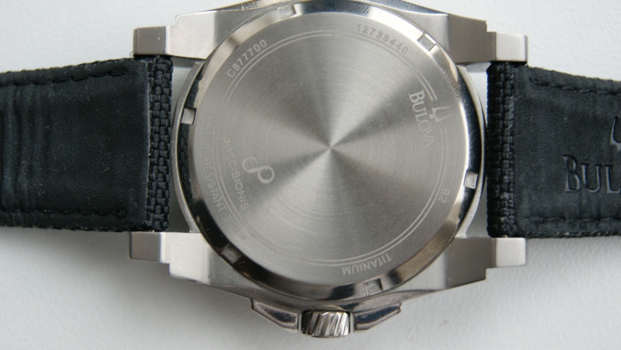 В Bulova 96B132 установлен кварцевый механизм серии precisionist. Там использован кристалл кварца иной формы, за счёт этого увеличена частота его колебаний. В результате имеем точность +- 15 сек. в год и замечательно движущуюся секундную стрелку ярко синего цвета(фото его не передаёт), с символом бесконечности в основании. Стрелка просто плывёт. За ней реально хочется наблюдать. Имеется механизм быстрого перевода даты.