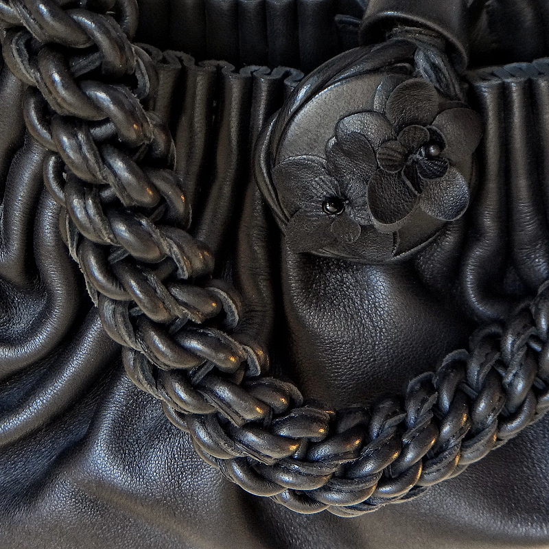 Сумка закрывается на кожаный хлястик, украшенный двумя цветками.