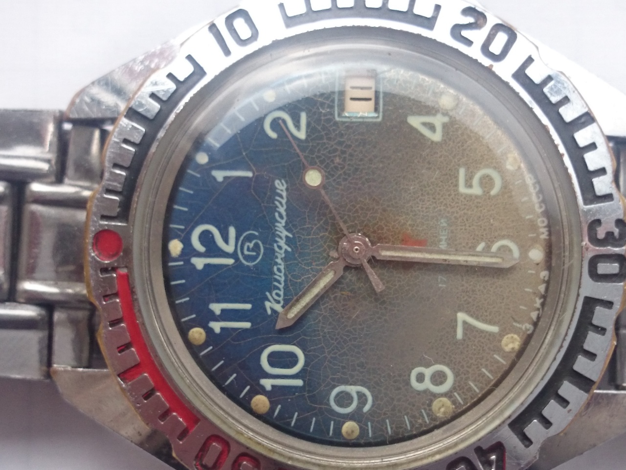 Командирские Заказ МО СССР, из личной коллекции. На ходу. Механизм 2414. Заводная головка на резьбе. Точность хода и водонепроницаемость не проверял. Продаю по причине оптимизации сета. В комплекте браслет времен СССР. Из недостатков слегка выгоревший циферблат от времени. Приоритет - личная встреча в Москве по будням. Возможна пересылка по России после 100% оплаты на карту СБ. Пересылка 200 руб.