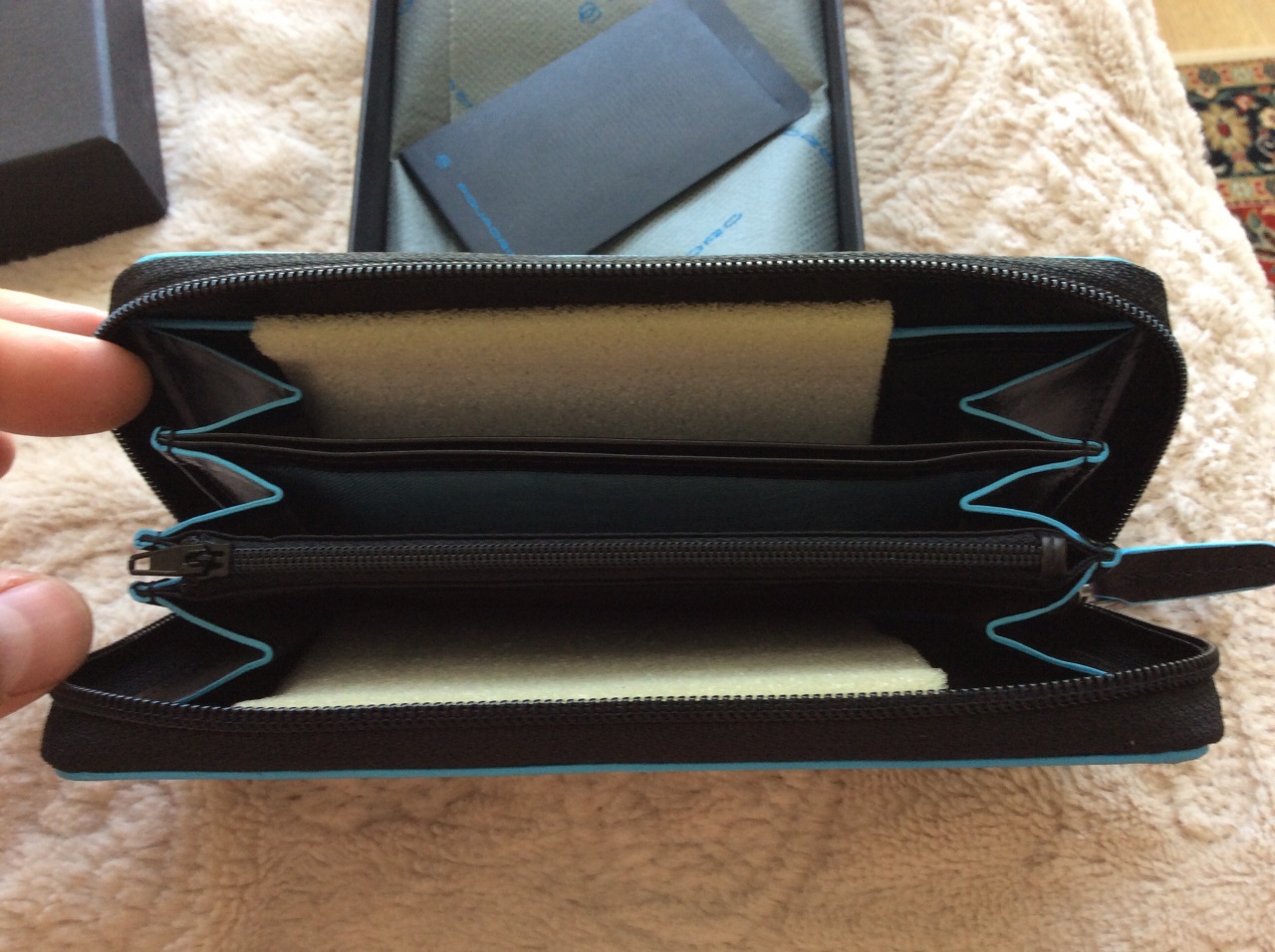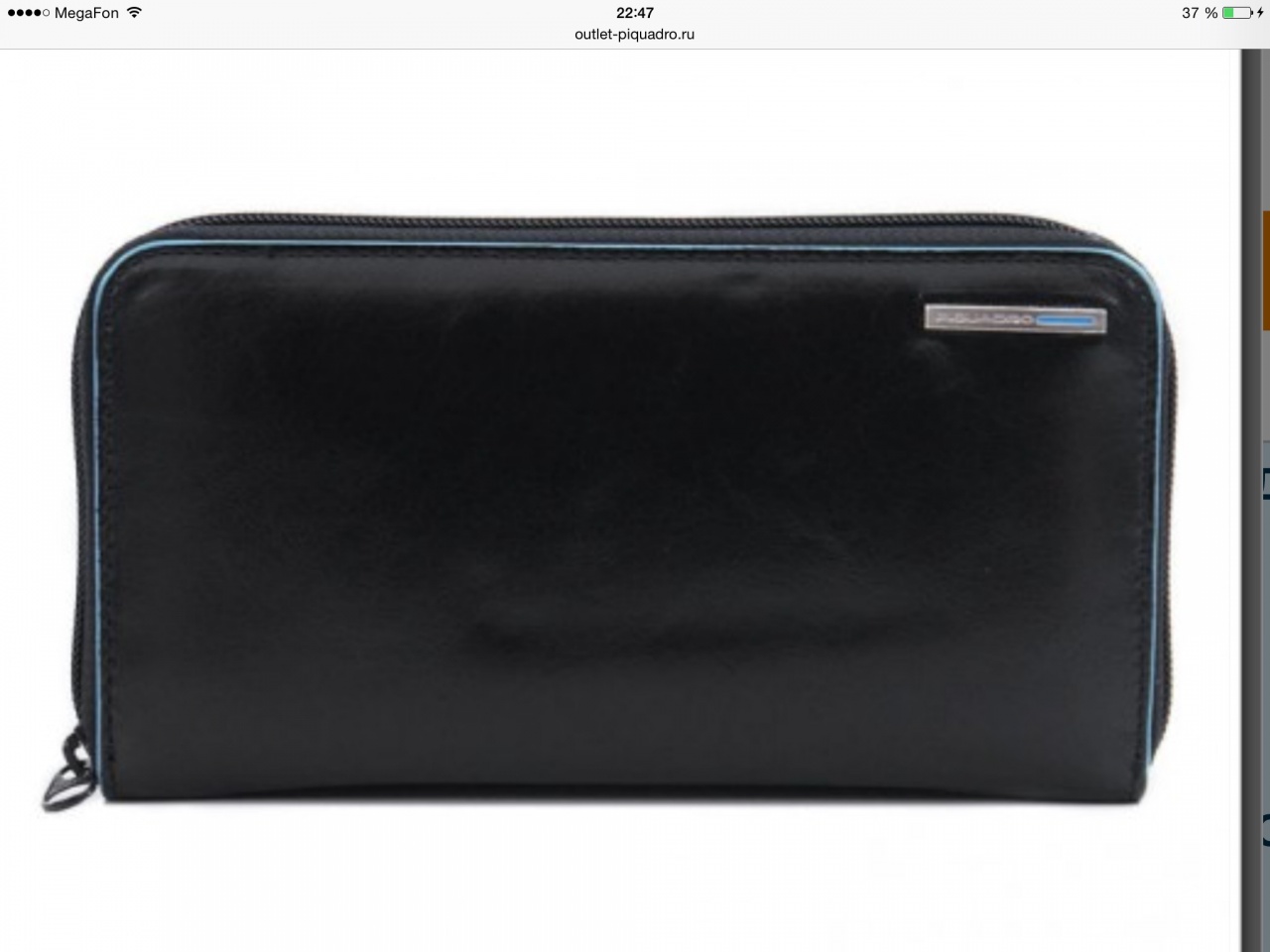 Горизонтальное портмоне Piquadro на молнии выполнено из кожи и отстрочено по краям. Переднюю верхнюю часть украшает горизонтальная металлическая вставка с гравировкой Piquadro и голубой полосой. Портмоне имеет два основных отделения, в каждом из них находится отдел для купюр и кредитных/визитных карт. В центре – большой карман-монетница на молнии. Удобное портмоне могут использовать как мужчины, так и женщины.
