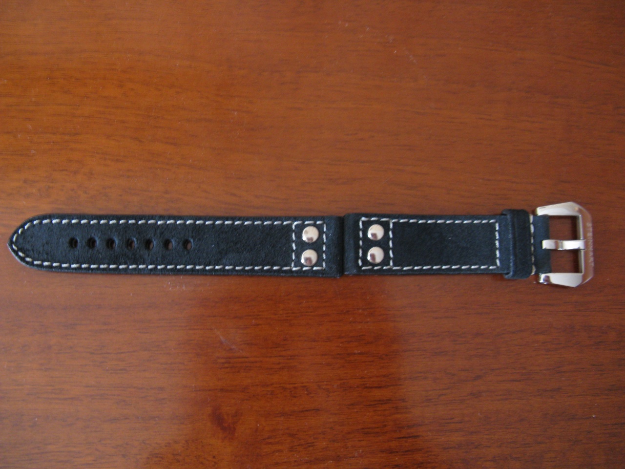 - про запас был закуплен ещё один ремень - 22х20 мм, чёрный винтажный под нубук с белой строчкой и простой застёжкой с логотипом фирмы - очень приятный по тактильным признакам, но чуть короче (кстати, на моём запястье вторая штрипка не нужна на обоих ремешках - я их убрал); застёжка могучая; в целом качество ремней отличное - молодцы китайцы!