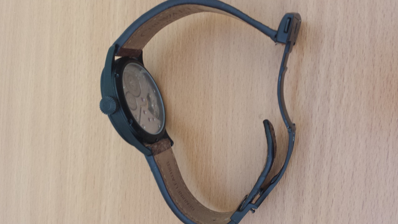 Корпус диаметром 44 мм выполнен из нержавеющей стали с черным PVD-покрытием, на задней крышке установлено сапфировое стекло, через которое можно наблюдать за работой механизма Unitas 6498 с ручным заводом, с 40-часовым запасом хода. Обратите внимание на кожаный ремешок, также выполненный в винтажном стиле - он оснащен запатентованной застежкой, разработанной Christopher Ward совместно со швейцарской компанией Jorg Bader.