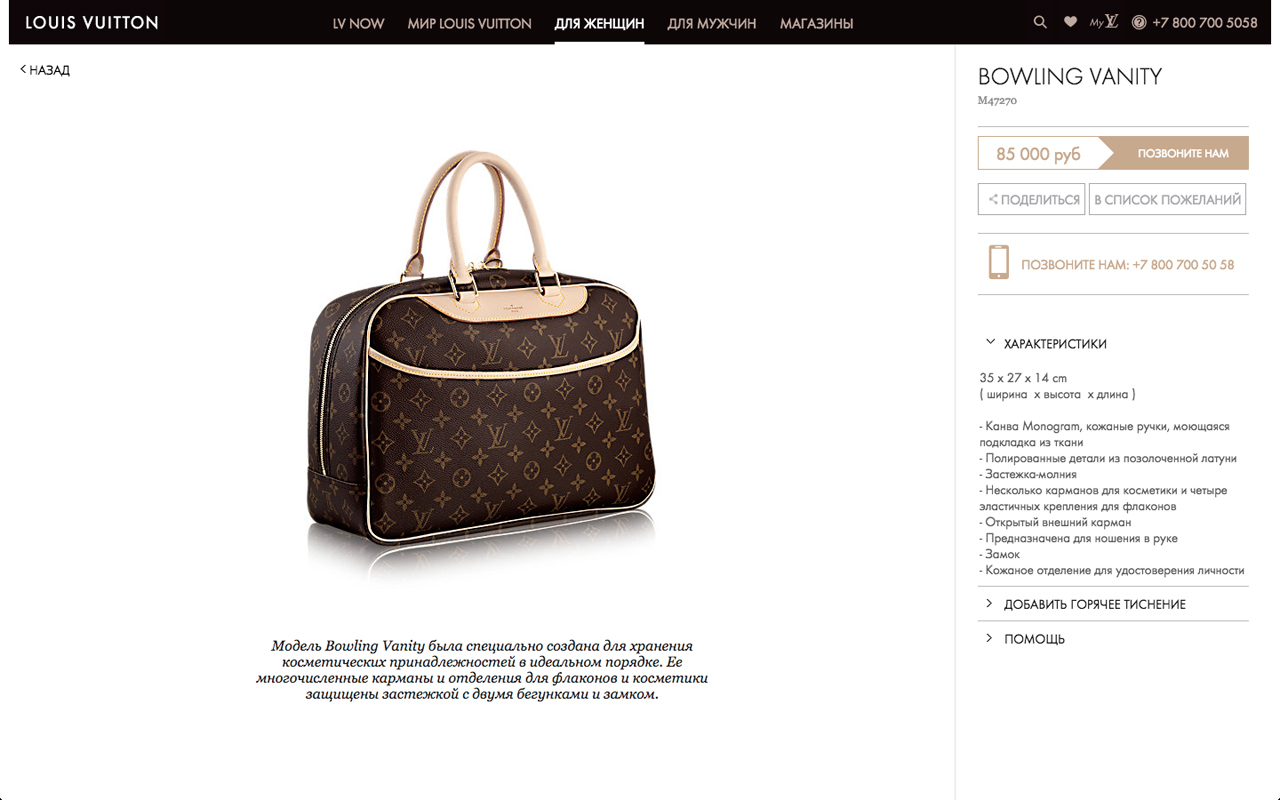Полное название модели Louis Vuitton Monogram Canvas Deauville, в России и некоторых странах Европы продается под названием Bowling Vanity.