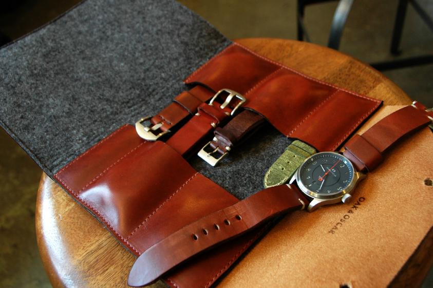 Поставляется на коричневом кожаном ремешке с застежкой из нержавеющей стали, а также с темным высокопрочным нейлоновым ремешком. В комплект поставки входит кожаный чехол с кармашками для хранения запасных ремешков.