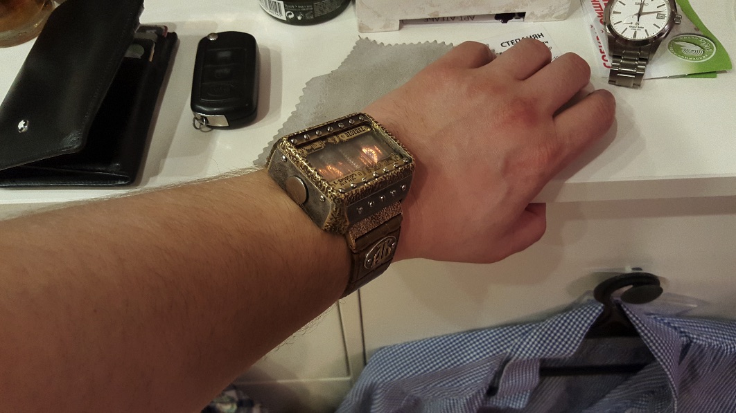 Часы несмотря на их довольно внушительный размер, сидят на руке отлично, вес не ощущается вообще. Индикация идет по нажатию, поэтому аккумулятора хватает на 2 недели. В общем однозначно часы будут не только в коллекции, но и довольно часто на руке, особенно когда нужно удивить кого-то.