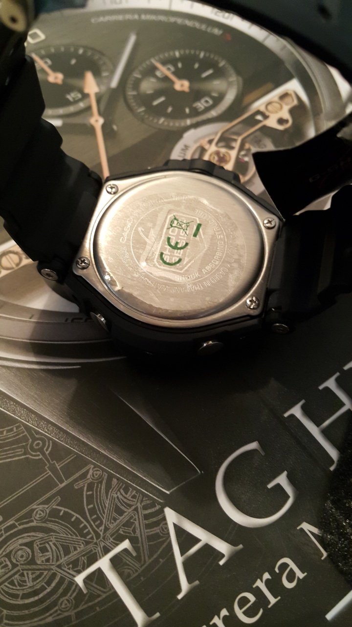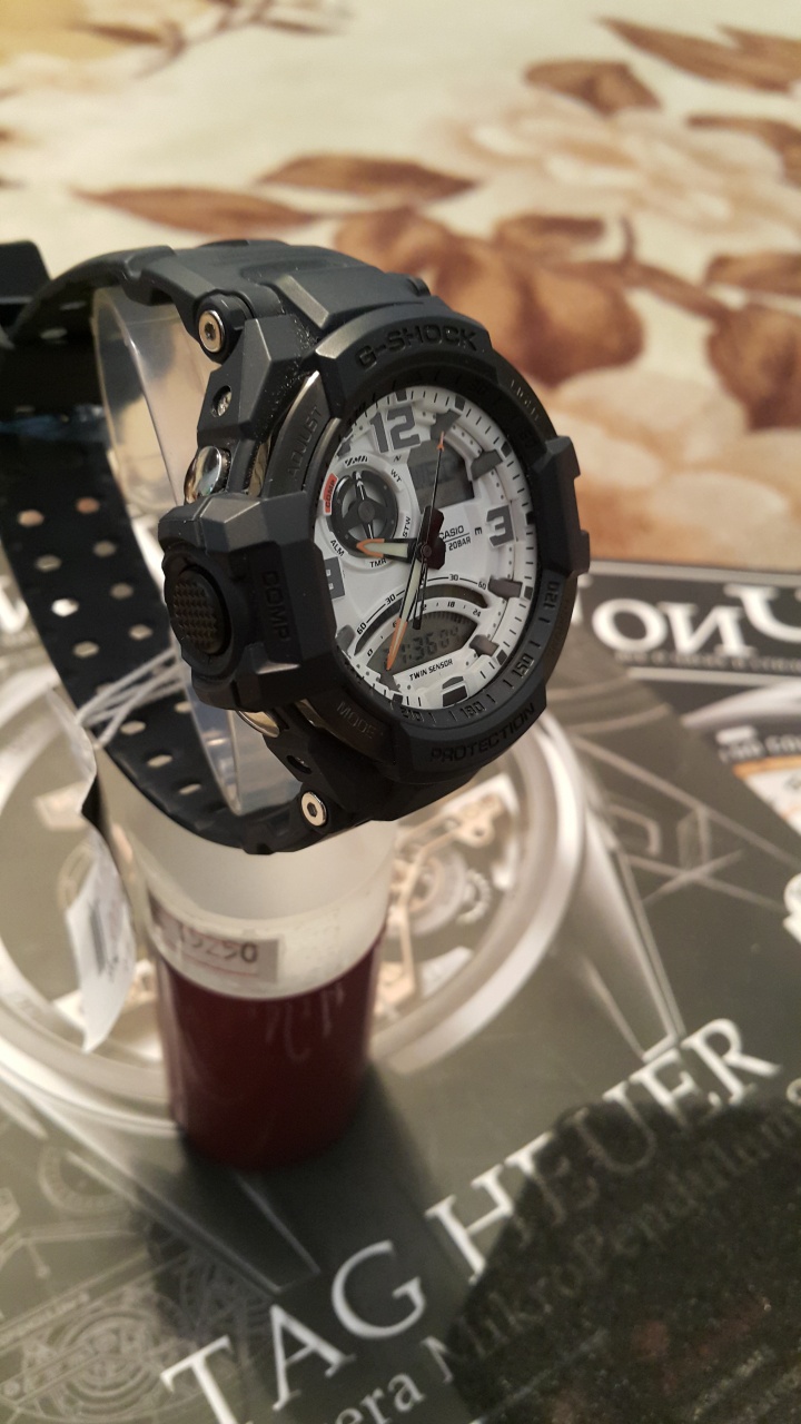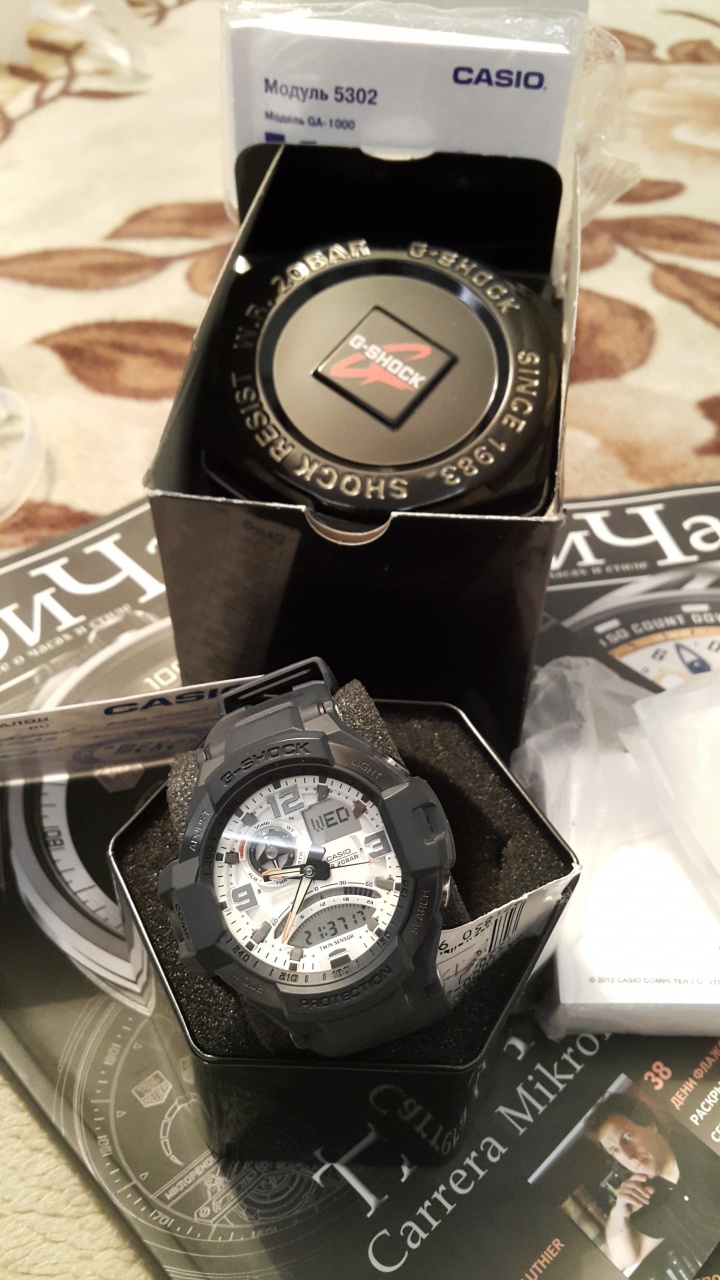 G-Shock. Светодиодная автоподсветка с флюорисцентным напылением на стрелках и дисплее часов - при повороте часов в сторону лица подсветка дисплея осуществляется автоматически. Светонакопительное покрытие необрит продолжает светиться в темноте даже после непродолжительного пребывания на свету. Ударопрочная конструкция защищает механизм от ударов и вибрации. Встроенный цифровой компас. Термометр от -10° до +60°С с точностью 0,1°C. Секундомер с точностью показаний 1/100с и временем измерения 24ч. Таймер обратного отсчета от 1мин до 1ч. Мировое время. 12-ти и 24-х часовой формат времени. Функция включения/отключения звука. Стальной безель.
