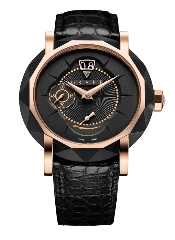 Компания Graff Diamonds была создана в 1960 году Лоуренсом Граффом. Часовая же история успешной ювелирной марки началась не так давно: в 2008-м были показаны первые пять коллекций. Конечно, производство расположено в Швейцарии, но модели имеют все признаки английского стиля. Новое поколение элегантных часов GraffStar Grand Date оснащено механизмом с ручным заводом Graff Calibre 1, специально разработанным и произведенным для Graff в Швейцарии. Помимо часов и минут, этот механизм отвечает за индикацию даты, секунд и 50-часового запаса хода. Фирменный часовой корпус напоминает грани бриллианта-солитера, где ушки крепления ремешка играют роль крапанов, удерживающих камень в оправе. Новый черный разноуровневый циферблат, гладкий у края и гильошированный в центре, с золотыми элементами индикации, придает модели стильный современный вид. GraffStar Grand Date снабжены черным ремешком из крокодиловой кожи с эксклюзивной раскладывающейся застежкой Graff. Модель представлена 100 экземплярами в каждой из следующих версий: розовое золото, белое золото, розовое золото и DLC, белое золото и DLC.