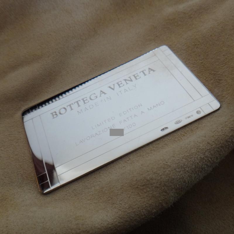 Внутри сумки - табличка из серебра 925 пробы, с индивидуальным номером сумки в серии. На табличке проставлены клейма Bottega Veneta и пробы серебра.