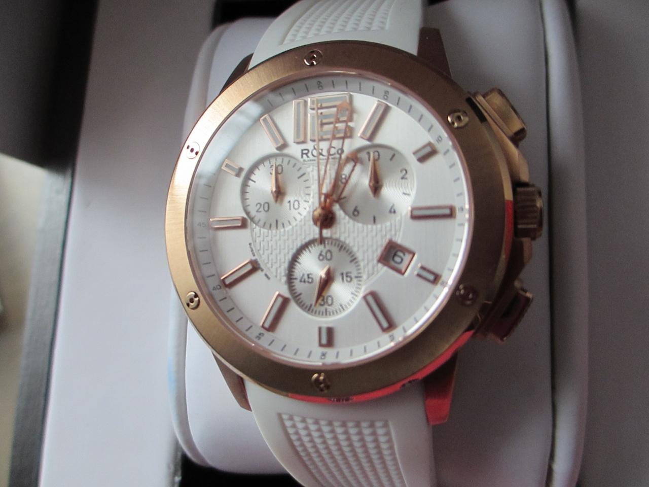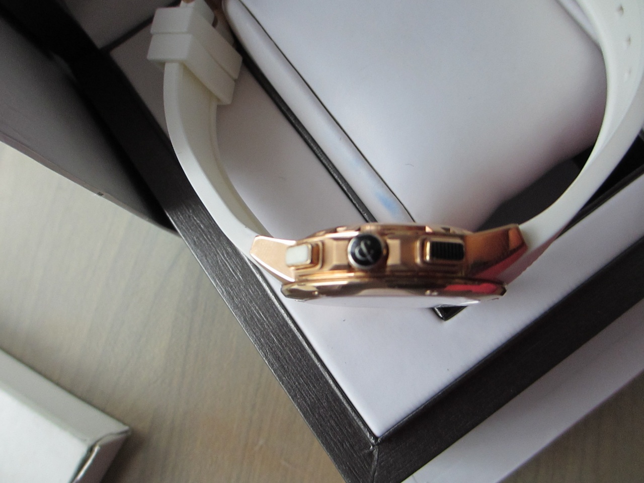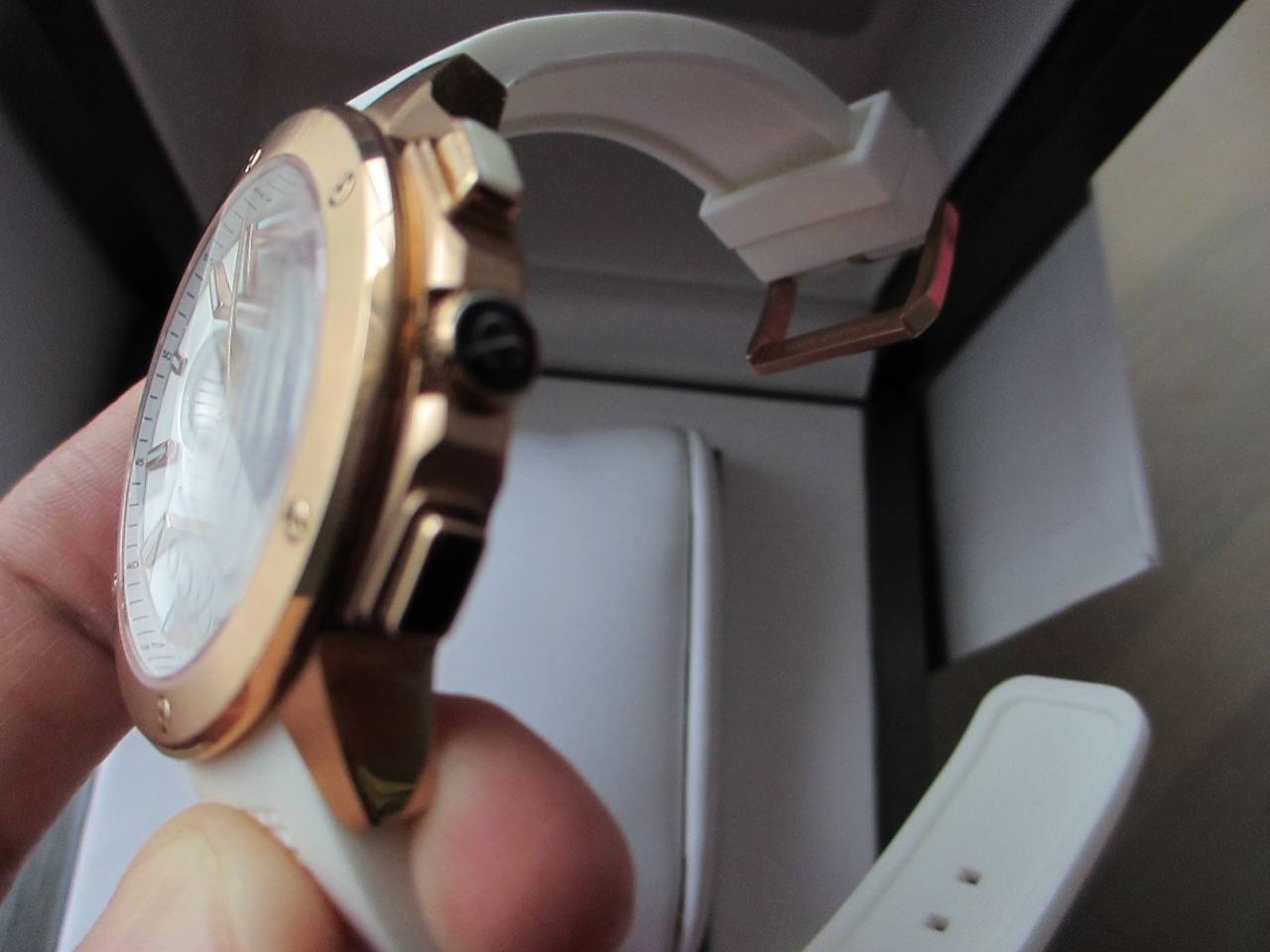 Часы новые, но кнопка "пуск" хронографа имеет белую накладку вместо черной (выглядит интересно, как-будто так и задумывалось)