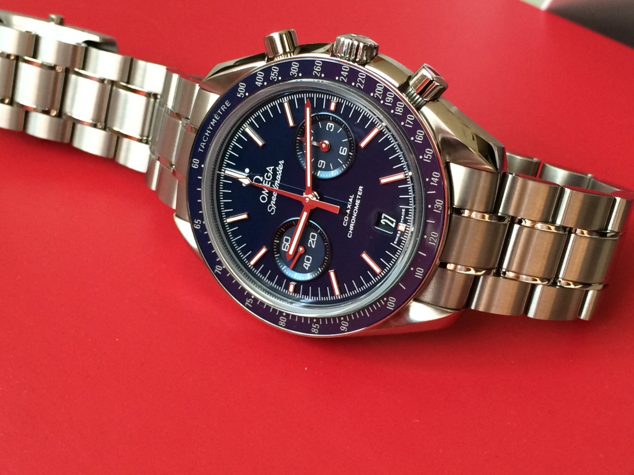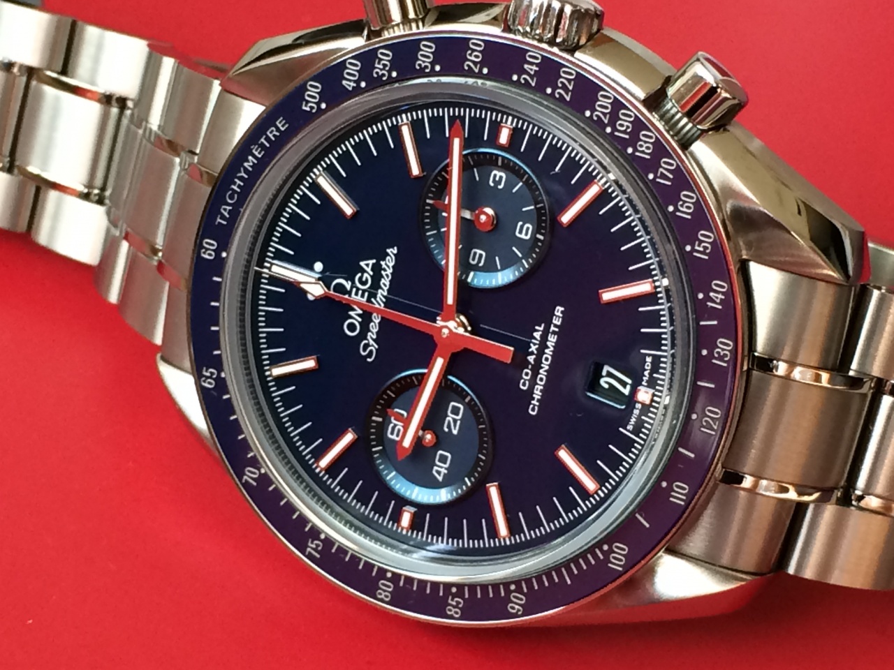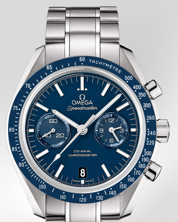 OMEGA Speedmaster – одни из самых культовых часов OMEGA. Побывав во всех шести лунных экспедициях, легендарные часы Speedmaster стали впечатляющим символом, выражающим первопроходческий дух марки OMEGA. Эта модель имеет лакированный синий циферблат с малой секундной стрелкой в положении «9 часов» и совмещенными 12-часовым и 60-минутным счетчиками на вспомогательном циферблате в положении «3 часа». Имеются также центральная стрелка хронографа и окошко указателя даты в положении «6 часов». Эффектный циферблат защищен устойчивым к царапинам сапфировым стеклом. Полированный синий керамический безель с тахиметрической шкалой закреплен на титановом корпусе диаметром 44,25 мм с титановым браслетом. Основу этих часов составляет калибр 9300 – первый коаксиальный часовой механизм OMEGA с хронографом.