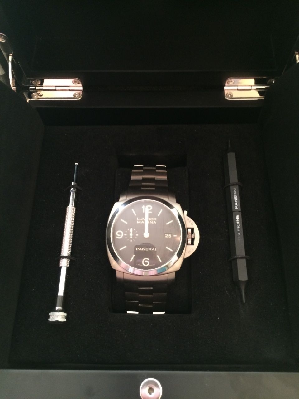 РЕМЕШОК: Фирменный титановый браслет PANERAI с вертикальной матовой отделкой и полированными поверхностями между звеньями. Пряжка из титана и стали. Поставляется с инструментом для замены браслета и стальной отверткой.