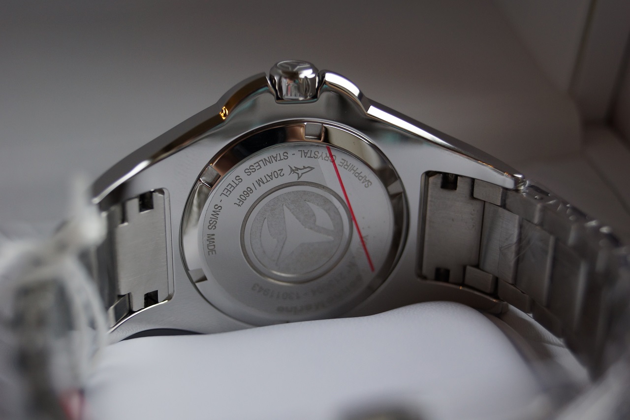 Эти боковины корпуса инкрустированы бриллиантами, напоминающими светлые отметины, украшающие спину и кончики плавников ската. Стальной корпус и браслет украшены вставками из темно-серой керамики, воспроизводящей благородный цвет спины ската Манта, а также защищающей часы от царапин. В такой же гамме выполнен вращающийся рант с дайверским кольцом и циферблат, гравированный волнистым узором.