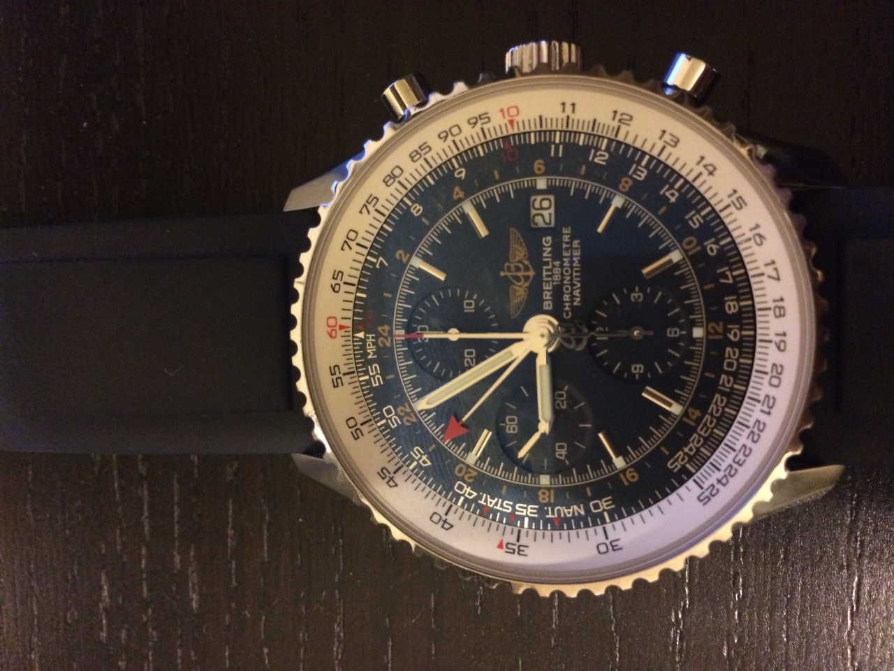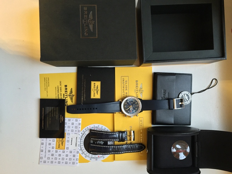 Продам Breitling Navirimer World в синем цвете. Часы полностью укомплектованы, документы, коробка, куплены летом 2013 года в Консуле, международная гарантия 2 года. Оригинальный кожаный ремешок поменян на оригинальный каучуковый, оба ремешка прилагаются к часам (тоже Breitling, разумеется). К коробке все документы,чеки, вплоть до снятых с часов пленок. Состояние прекрасное, часы "выходного дня" (не единственные в коллекции).