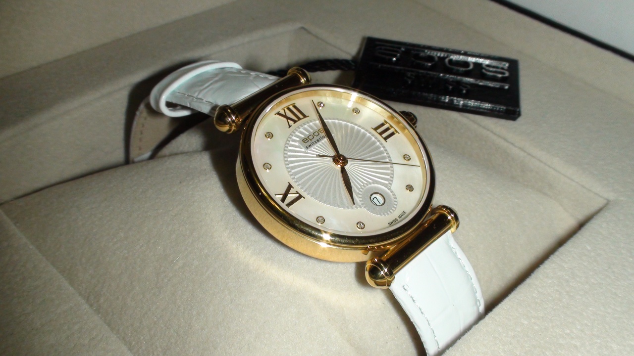 Элегантные женские часы швейцарской фирмы Epos на белом кожаном ремешке.