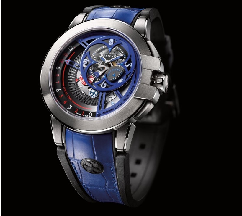 Круглый корпус новинки, изготовленный из 18-каратного белого золота, диаметром 44,2 мм. На торце рифленой защищенной заводной головки, расположенной на 3 часах, выгравирован логотип бренда Harry Winston. Сапфировое стекло установлено на передней части часового корпуса и на его завинчивающейся задней крышке. Циферблат многослойный, частично скелетонизированный, выполненный с элементами синего, красного и черного цвета. Модель оснащена швейцарским автоматическим механизмом, состоящим из 281 детали, с функциями индикации местного времени (посредством ретроградной синей анодированной алюминиевой стрелки на 12-часовой секторной шкалы, расположенной на периферии циферблата от 6 до 10 часов), домашнего времени (посредством соответствующих часовой и минутной стрелки на малом боковом циферблате, расположенном на 13 часах), индикатор дня/ночи расположен на 3 часах, цифровой указатель даты - на 4 часах, указатель запаса хода - чуть выше 6 часов. Калибр отменно отделан и декорирован. Поставляется на черном каучуковом ремешке, прошитом с наружной стороны с синим ремешком из кожи аллигатора с застежкой из 18-каратного белого золота.