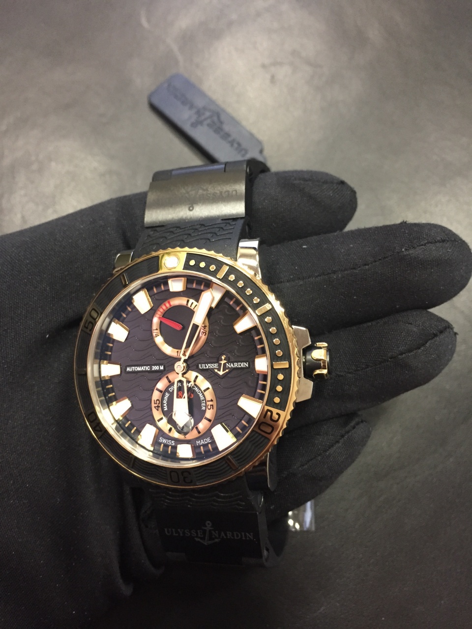 Описание: Новинка 2013 года. Maxi Marine Diver Titanium— новое пополнение модельного ряда Maxi Marine Diver. Спортивные часы выполнены в уникальном гипоаллергенном корпусе из титана и золота. На корпусе диметром 45 мм расположен вращающийся в одном направлении безель. На циферблате, украшенном узорами в виде волн, расположены люминесцентные стрелки. Черный каучуковый ремешок, также декорированный волнами, со вставками из керамики служит дополнением циферблата и безеля. Прозрачная задняя крышка корпуса предоставляет возможность наблюдать за работой часового механизма с ротором, покрытым рутением. Часовой механизм с автоподзаводом, получивший официальный сертификат хронометра (C.O.S.C), снабжен индикатором запаса хода и отдельно вынесенным малым циферблатом секундной стрелки. Часы водонепроницаемы - до 200 м. Корпус каждых часов имеет индивидуальный номер.