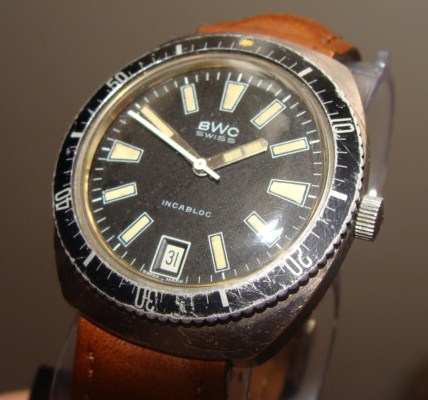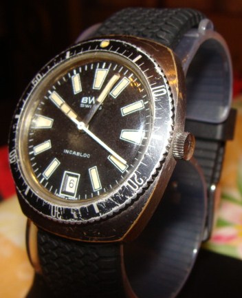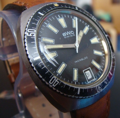 Противоударный баланс, крутящийся безель, 17 камней, светонакапливающие метки и стрелки, 50 метров водозащита, нержавеющая сталь, окно даты на 18.00, также эти часы BWC имеют швейцарскую систему анкерного спуска, стальные анкерные колеса и вилки, опору на рубиновых камнях, заводные часовые пружины из специальных прецизионных сплавов и противоударное устройство узла баланса... Вообщем, полный боекомплект Рембо того времени. Часы очень ударно смотрятся в черном исполнении и на черном каучуке. Часы в Москве. Ценник 15500 руб.